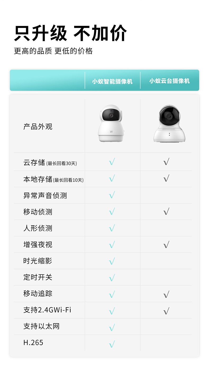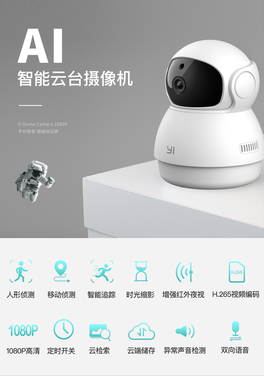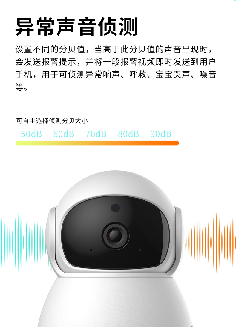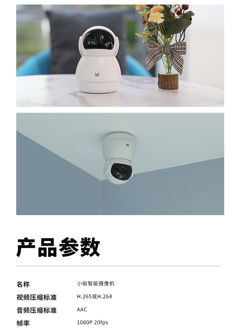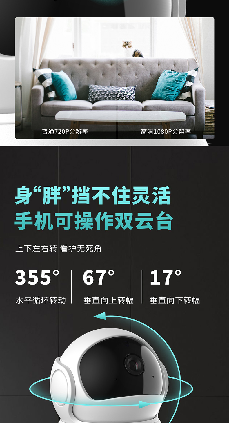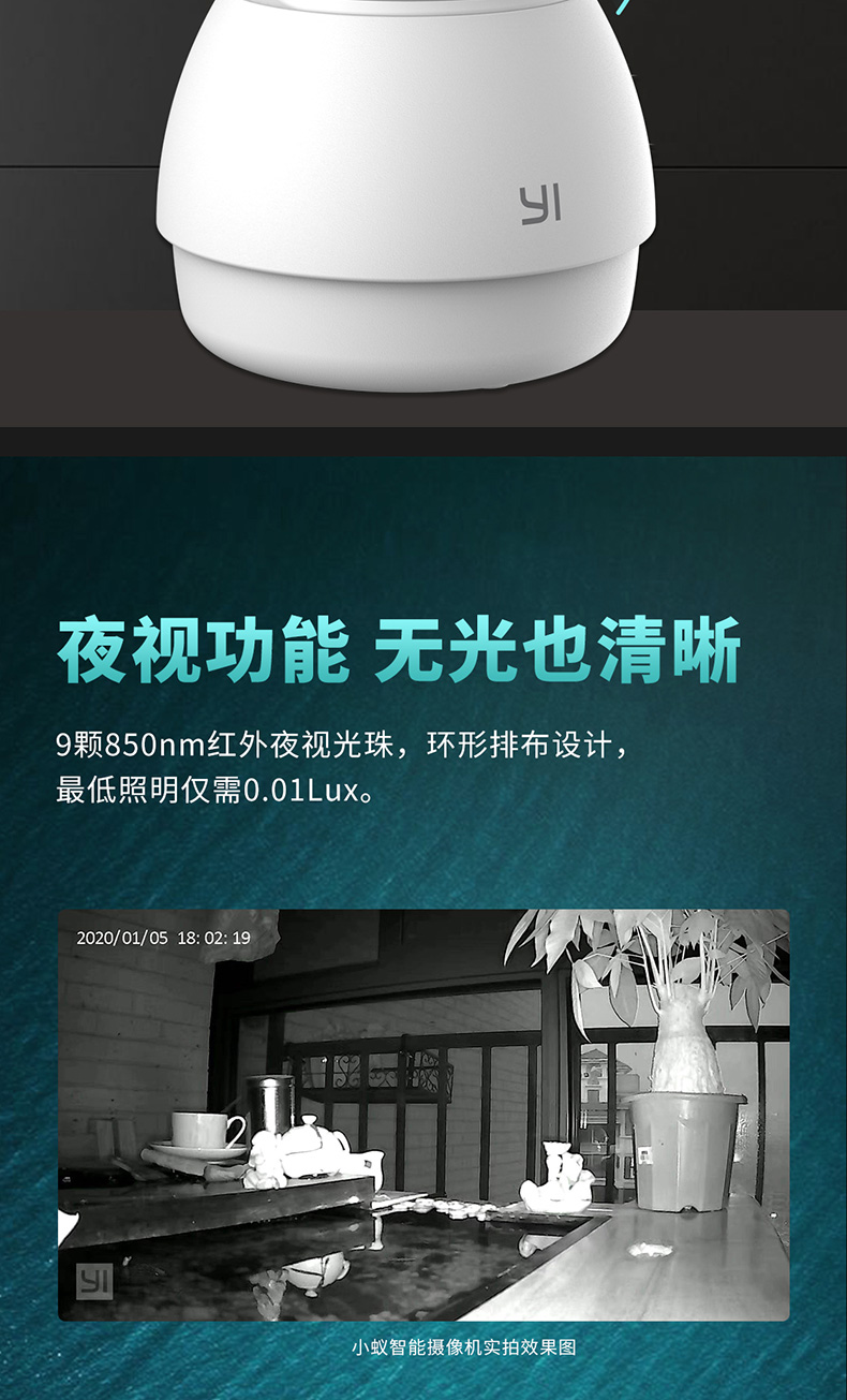 这款智能摄像头由小米生态链企业生产,标配200万像素1080P画质摄像头,图像更清晰;支持水平355度、垂直上67度,垂直下17度转头,不留监控死角,拍摄范围更广。拥有9颗红外夜视珠,夜晚图像清晰可辨。支持双向语音功能,且分为对讲、电话模式,老人小孩轻松使用。