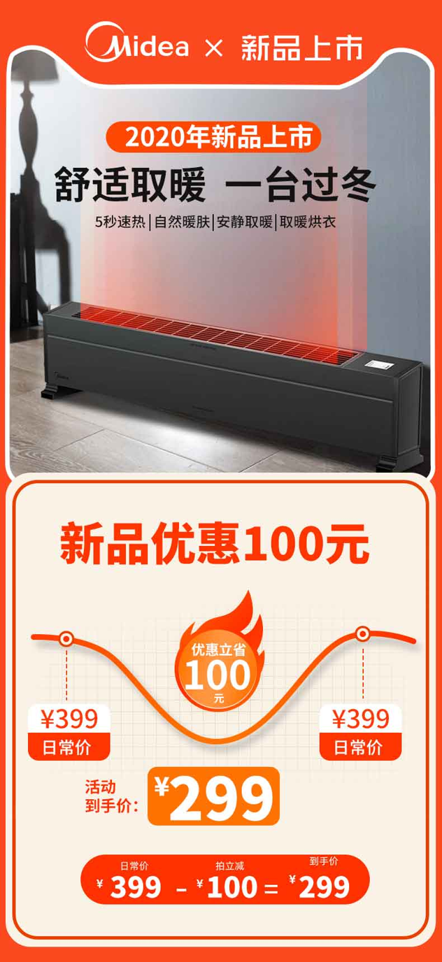 =279元 到手价,下单还赠送加湿器,晒图还有20元返现。美的出品的踢脚线取暖器,5秒速热,20平的房间整屋升温仅需10分钟。