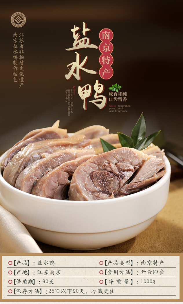 正宗南京美食老卤盐水鸭,传统工艺制作,精选优质材料,地道老味道,色如白玉,肉质香软,清香不腻。江苏省非物质文化遗产示范基地,品质靠谱。规格:1000g。