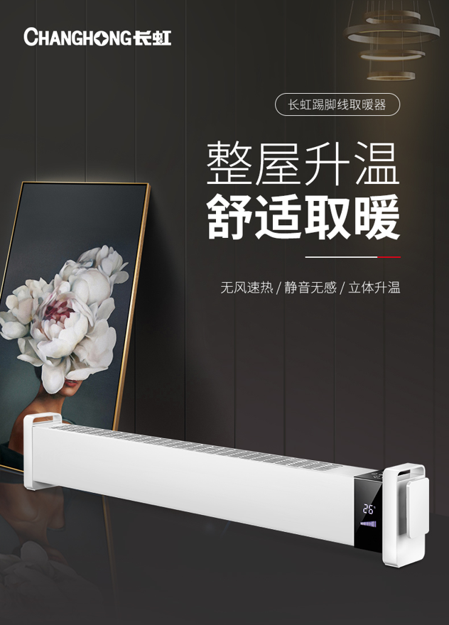 长虹踢脚线取暖器,加高加大发热体积,铝合金翅片发热体,极速升温。 智能恒温设计,整体阻燃防烫机体,有倾倒断电,过热保护自动断电多重安全防护,使用安全质量靠谱。