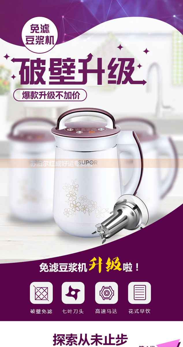 这款苏泊尔 豆浆机,采用当下流行的无网免滤技术,边旋磨边地盘加热,把豆渣也打成细腻的豆浆,味道更好,用着省事,免去老款豆浆机事先泡豆、再过滤豆浆的麻烦。采用专利静音环,降低噪音,比普通豆浆机更安静。