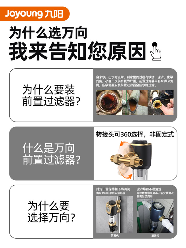 这款九阳的家用前置过滤器,滤网采用316医用级不锈钢材质,40微米高过滤精度,既能有效保证过滤效果,又能使冲洗有效,不至于造成堵塞。立体刮旋冲洗技术,如汽车雨刷般刮洗,无需拿出滤芯,使用方便。