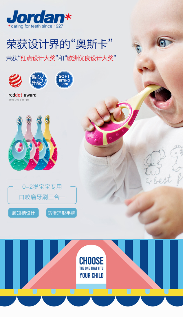 这款Jordan 进口婴幼儿宝宝乳牙刷,获得过“红点设计大奖”和“欧洲优良设计大奖”,专为0-2岁儿童设计的牙刷,口咬刷牙二合一。