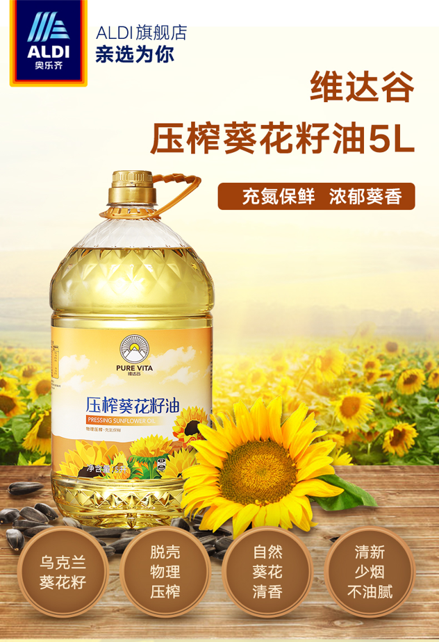 天猫ALDI旗舰店72.9元,下单立减8元,可领15元优惠券,实付49.9元到手,维达谷 天然压榨葵花籽油,原瓶进口,采用纯正葵花籽脱壳物理压榨,保留丰富的营养成份,反式脂肪酸<1%,富含维生素E,油质清澈透明,呈淡淡金黄色,清淡少油烟,高温烹饪、凉拌生吃皆美味。