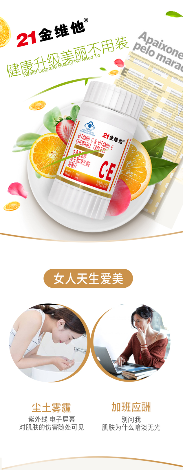这款21金维他 维生素C+E复合维生素片,同时补充维生素C和维生素E,适合成年女性。维生素C与维生素E协同作用,共同对抗紫外线与自由基对抗肌肤各种亚健康问题,美白养颜抗衰老,增强抵抗力,提升免疫力。