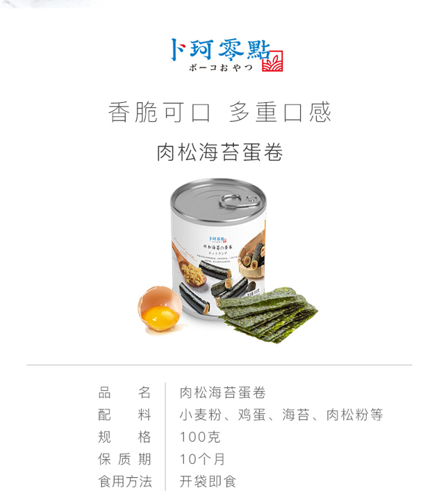 精选肉松、鸡蛋、海苔混合的神奇搭配,外脆内酥,鲜香可口;三重美味,口感层次丰富,好吃到舔手指~~儿童孕妇也能吃的放心零食。