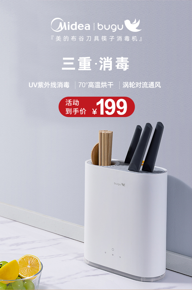 布谷是Midea美的旗下互联网品牌,这款BUGU 布谷智能紫外线消毒烘干刀筷架,可放10双筷子11把刀;适配市面上99%不同厚度的厨房用刀,木筷、竹筷、金属筷、塑料筷都可以放,70℃高温对流烘干,筷子不发霉,紫外线杀菌率99.9%;具备每4小时巡航杀菌功能,梅雨天也不怕发霉,可拆洗模块,一冲即净,一天仅需0.1度电。