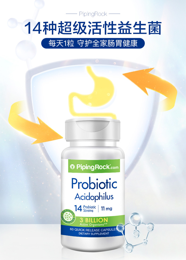 这款PipingRock 益生菌胶囊,美国原装进口,含有14种超级活性益生菌,经过多项实验临床实验,拥有UL认证、cGMP认证、USP、FDA、21 CFR、过敏源检测等多项美国权威认证。能够改变肠道微生物菌群,减少有害菌,增加有益菌,促进肠道健康,无腹泻无腹痛,适合消化不良人群、便秘人群、免疫力差人群。