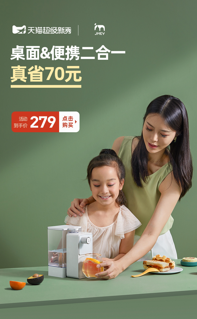 天猫jmey集米旗舰店349元,可领150元优惠券,实付199元到手,这款集米饮水机 可连接日常30mm口径矿泉水,另外还可连接90公分管线外接桶装水,非常使用。3秒即热,现烧现喝新鲜热水。拥有7档水温可选,泡茶、泡奶粉、冲咖啡,冲燕麦等满足日常不同温度所需。迷你机身,口袋大小,方便移动携带,满足厨房,卧室,浴室、办公室不同场景需求,外出旅行携带也很方便。
