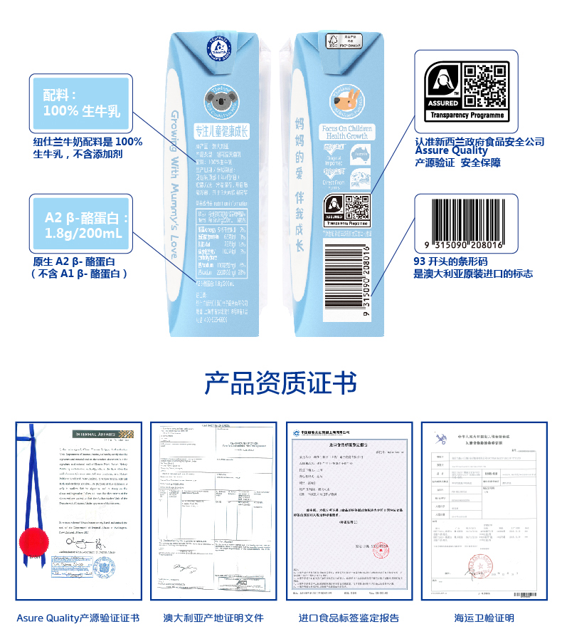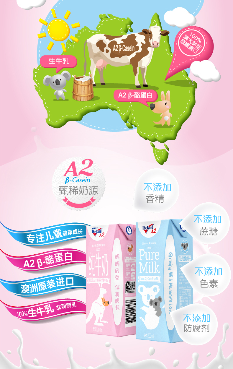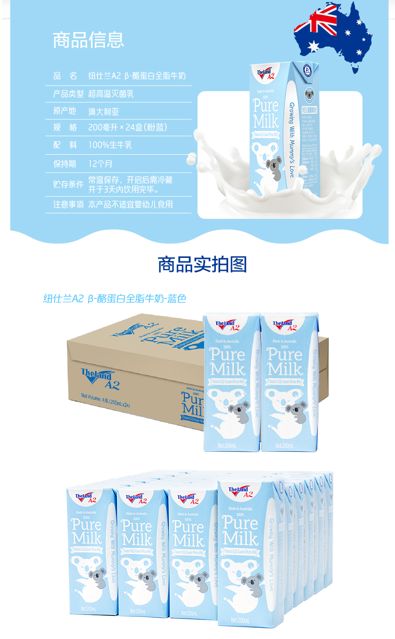 这款纽仕兰 A2 β-酪蛋白全脂牛奶,专注于儿童成长,澳洲原装进口,使用100%生牛乳非调制乳,在生产过程中不添加防腐剂、香精、色素、防腐剂等,每200ml牛奶中的蛋白质含量6.6g。