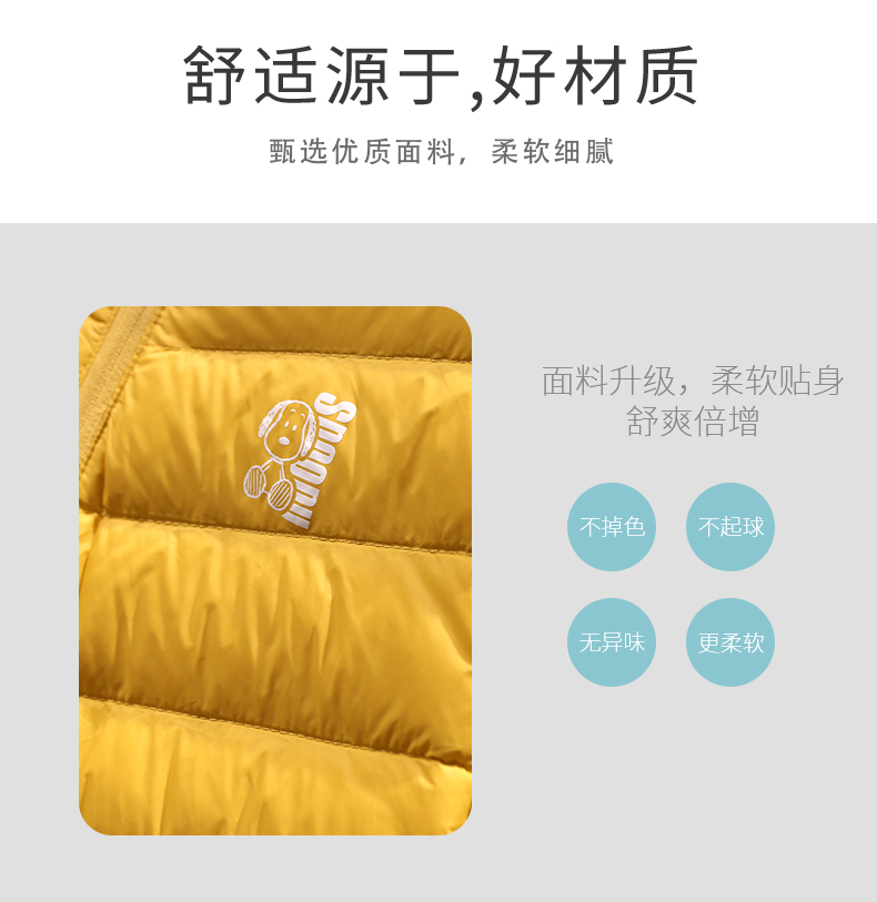 天猫童熹母婴专营店139元,可领40元优惠券,实付99元到手,男女多色可选,适合90-160cm身高儿童穿着。这款史努比羽绒服,内里填充90%白鸭绒,精选鸭腹部优质大绒朵,蓬松度高,保暖性好。羽绒经过消毒处理,健康安全。合体版型,基本不挑身材,胖瘦都能穿。细节上,袖口和下摆采用弹性罗纹设计,不易灌风,进一步提升保暖效果。