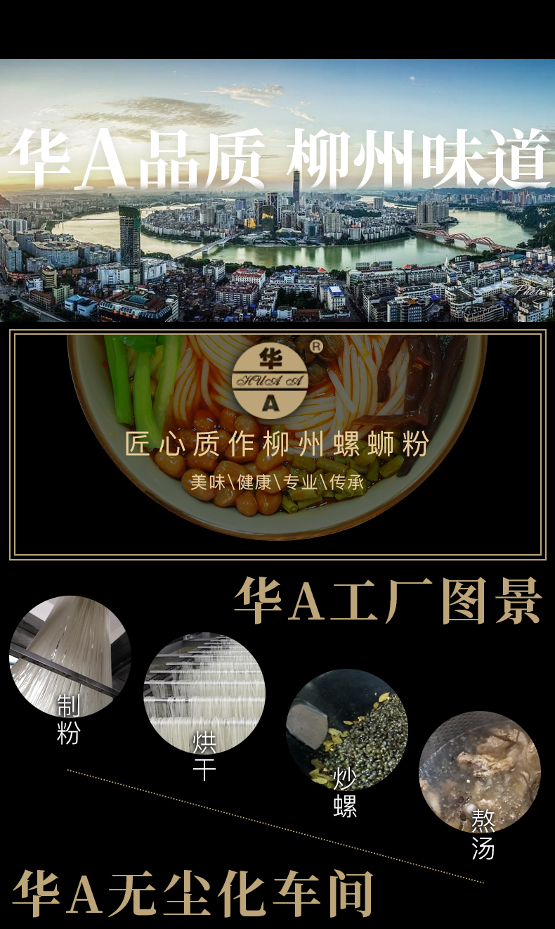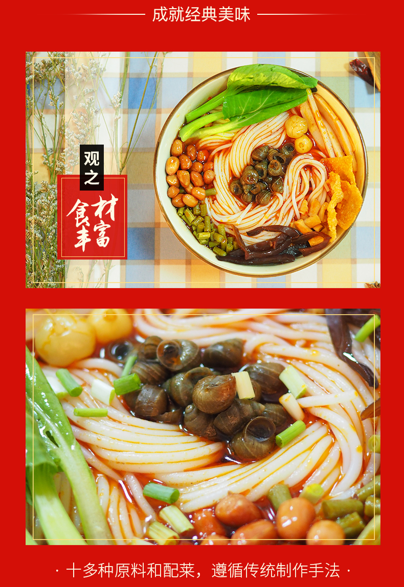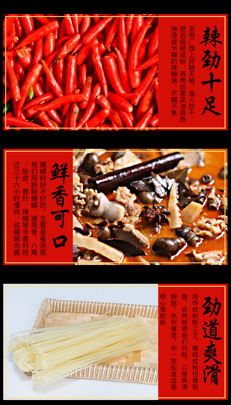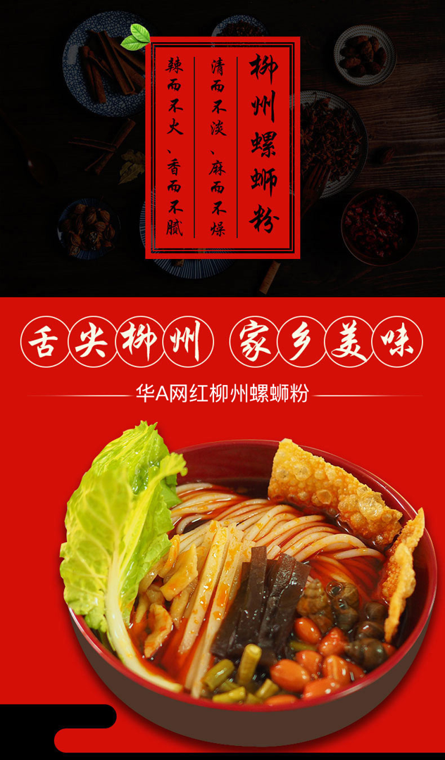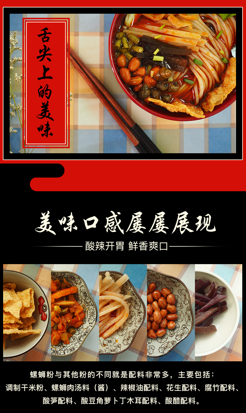汤底由精选柳州田螺、猪筒骨、朝天椒、山奈、八角、肉桂、丁香、沙姜、桂皮、陈皮、茴香等多种天然香料经过36小时小火慢炖,精制成酱,味浓酸辣,鲜香可口,形成柳州螺蛳粉特有的鲜美味道,让人吃了还想吃。
