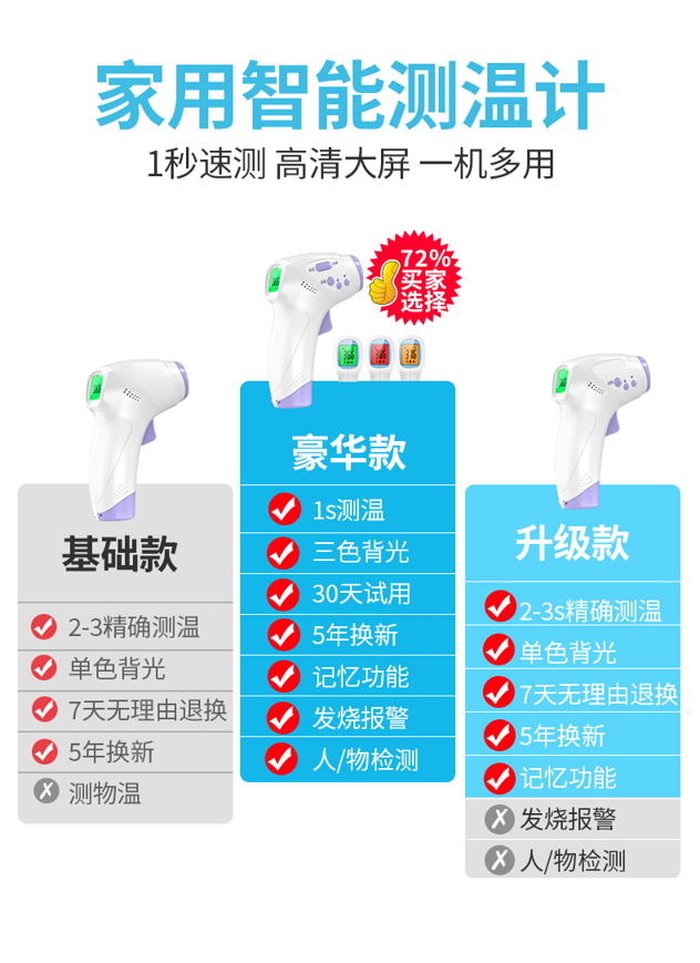 天猫吻音旗舰店49.9元,可领20元优惠券,实付29.9元到手,不接触人体皮肤,防止了交叉感染,方便快捷,可测水温、奶温、室温、食物温度等,一机多用。传统的体温计测温慢还十分易碎,水银吸入甚至会引起慢性中毒,多有不方便之处。这款体温计运用红外线,几秒就可快速测温,安全无辐射,3色背光显示提示,更稳妥贴心~