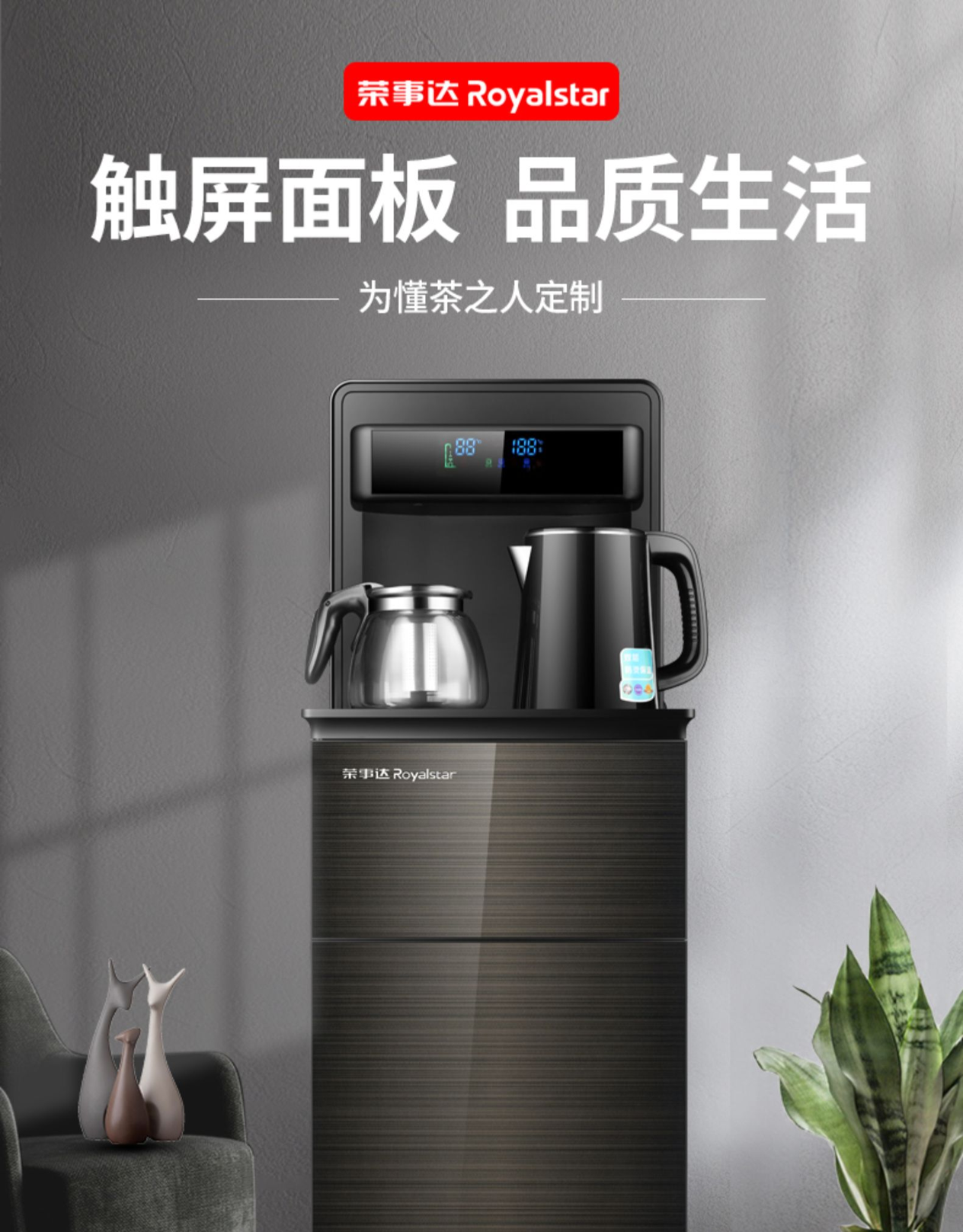 这台荣事达饮水机,下置式底座,隐藏式水桶设计,更换水桶省力方便。双壶设计,一个304不锈钢热水壶,一个高硼硅玻璃养生壶;底盘恒温有恒温功能,聚能加热圈,即开即热;240°旋转上水龙头,支持自动上水;智能触控面板,使用方便,有儿童锁设计。