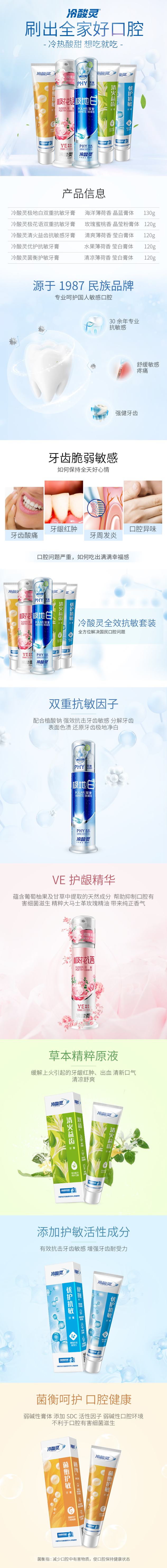 包含:冷酸灵极地白双重抗敏感 130g、冷酸灵极花语双重抗敏感泵式牙膏 120g、冷酸灵清火益齿抗敏牙膏 120g、冷酸灵优护抗敏牙膏 120g、冷酸灵菌衡护敏牙膏 120g。