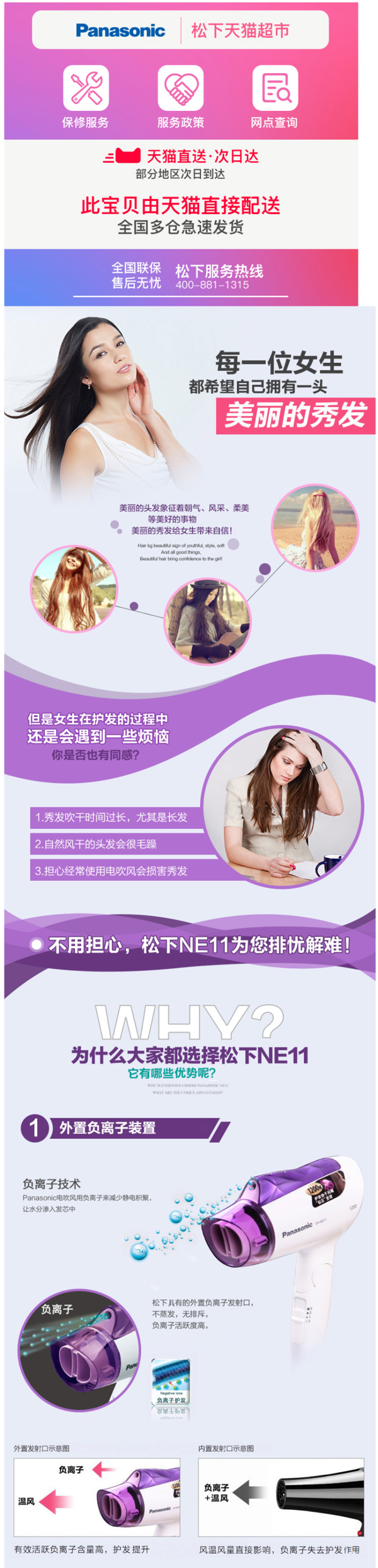 这款是松下吹风机的基础款,外置负离子发射口,可发射负离子中和头发中的静电,让水分子进入秀发,头发柔顺不毛躁,仅恒温和负离子就足以碾压很多品牌。