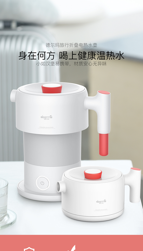 此款Deerma 德尔玛折叠电热水壶,采用食品级硅胶材质,经过ROSH/FDA认证,无异味,不含双酚A,采用304奥氏体不锈钢制作的发热盘、壶盖,烧水不易产生杂志,饮水更健康卫生。