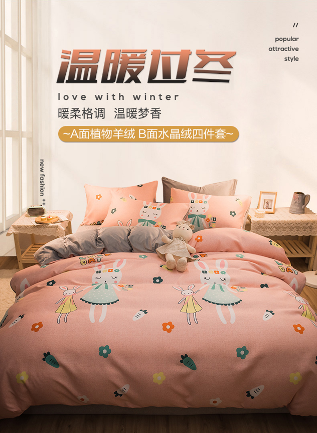 这款觉先生全规格珊瑚绒四件套,AB双面设计,保暖舒适,做工精致,防静电,不掉毛不起球,冬天常备的超暖四件套,带你走进恬适睡眠时光。