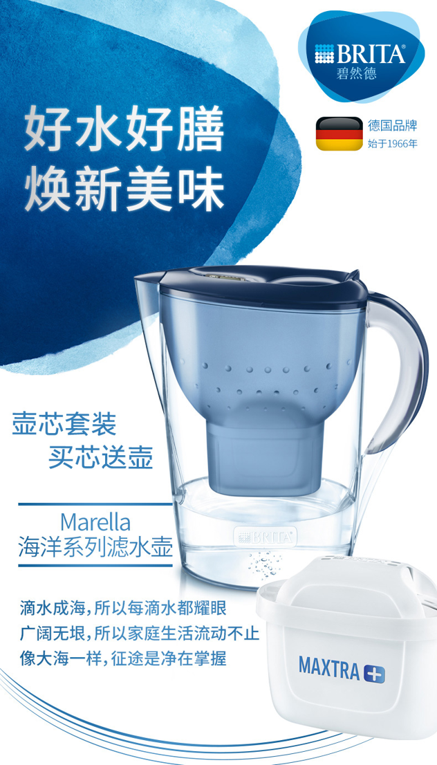 =324元 到手价(定金50+尾款274),1壶13芯。德国的Brita碧然德是过滤水系统行业的领头羊,这款Marella 海洋系列滤水壶容量为3.5L,每次可过滤2L,采用BPA-Free无毒塑料,防滑手柄,橡胶软脚,指压式开闭注水口,不用打开上盖就可加水,使用比较方便。