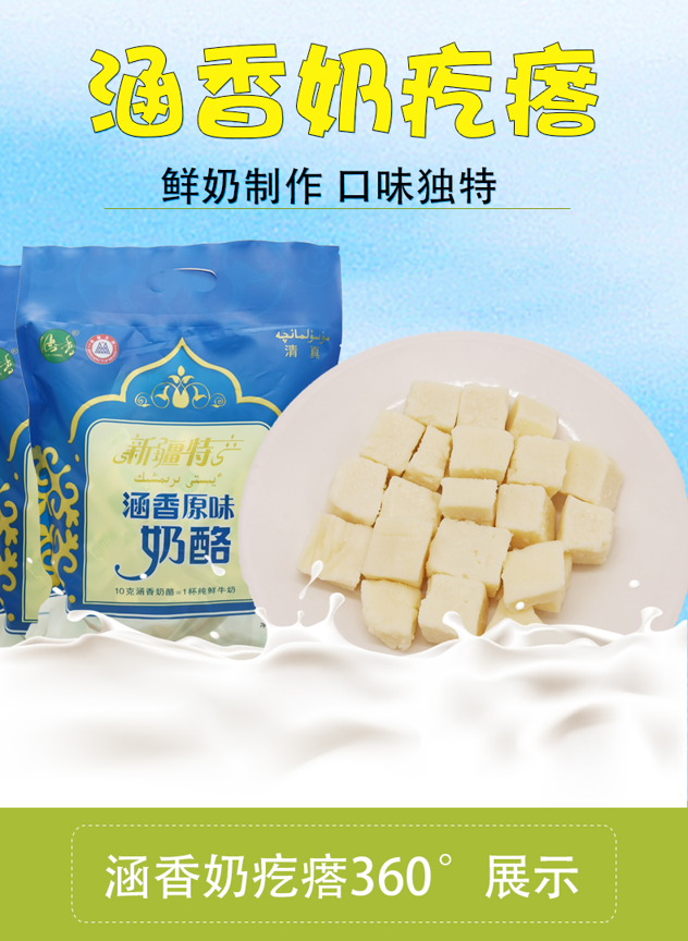 这款涵香新疆即食干吃奶酪,是将传统工艺与现代工艺相结合,使用纯牛奶、白砂糖、乳酸菌制成,就再无其他任何添加了,10g奶酪等同于一杯鲜牛奶,兼具营养和美味的口感,可以直接当休闲零食食用。