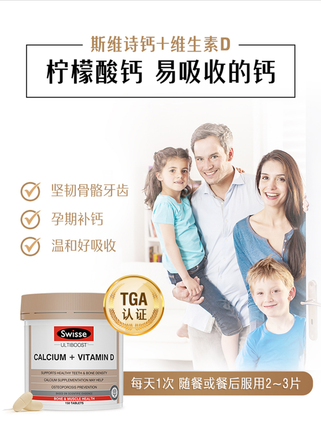 这款Swisse 维生素D柠檬酸钙片,澳洲进口, 可促进骨骼发育,预防骨质疏松,舒缓情绪,提高睡眠质量,缓解腰酸背痛和抽筋等症状;可预防和治疗高血压和心肌梗死。
