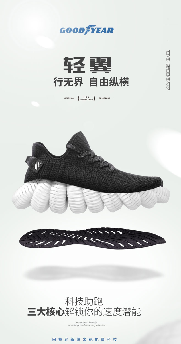 国际一线品牌固特异,固特异越野系轮胎大底,防水耐磨性一流、超强缓震,特殊花纹块,高度防滑。EPTU真爆米花科技中底,由千颗发泡微球构成,每个微小的能量单元都能提供独立的回弹能效。