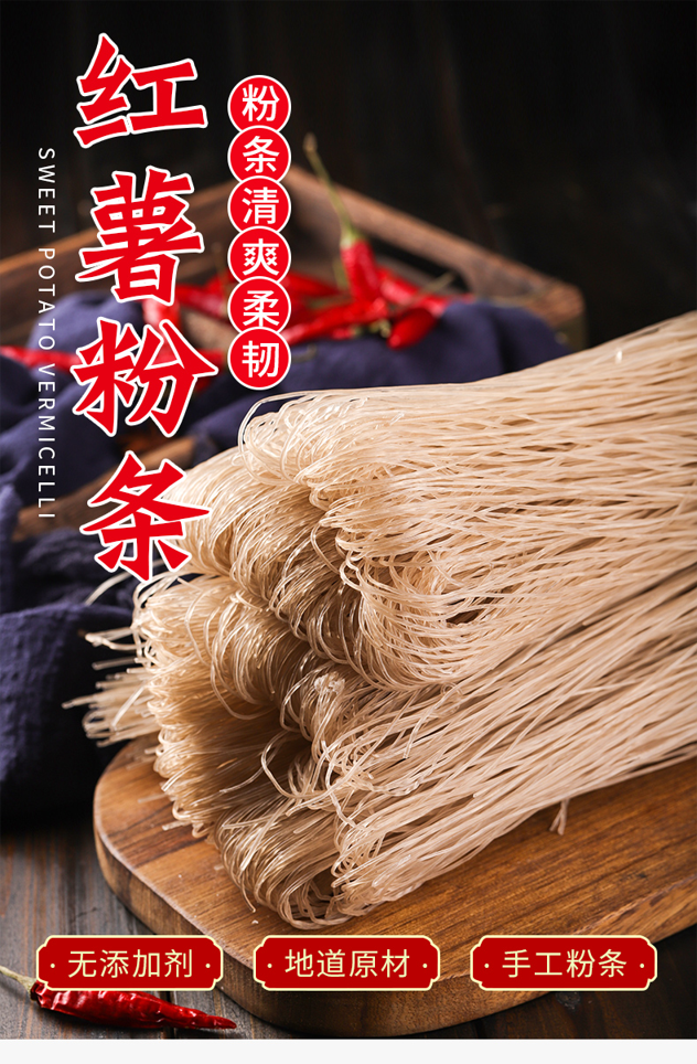 这款康尔美正宗100%纯红薯粉条,选用当地优质高淀粉类型的鲜红薯为原料,运用传统工艺结合现代技术,经过揉粉、漏粉、烘干而成,无明矾、色素、食用胶,丝条整齐,色泽清透。