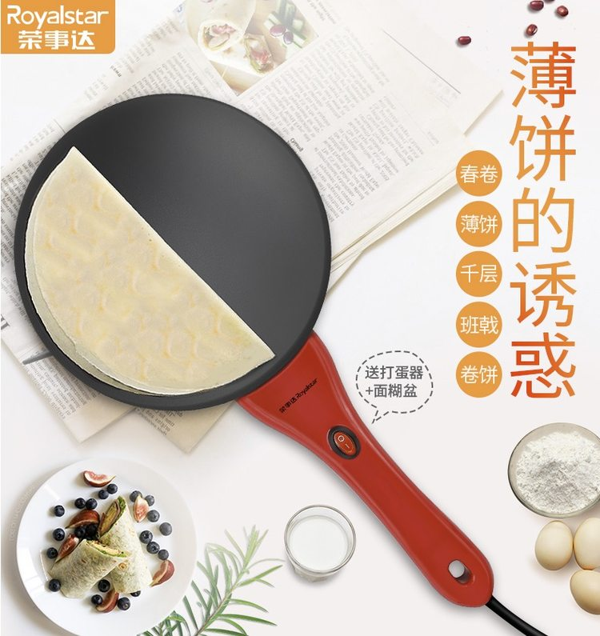 这是一款在抖音上超火的饼铛,进口食品级不粘涂层,制作薄饼春饼非常方便,600w大功率,加热不到1分钟就热了,小编的使用经验是面糊可以稍微稀一些,菜鸟发货次日达,全国联保,荣事达中国知名家电品牌,质量靠谱。