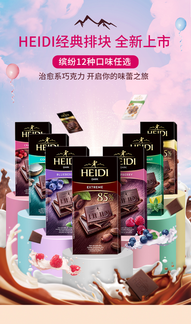 HEIDI 赫蒂是来自罗马尼亚的著名巧克力品牌,由瑞士百年巧克力世家Laderach家族创立,源自欧洲著名文学人物小女孩HEIDI的灵感,坚持采用瑞士精密研磨工艺,手工烘焙原粒整颗坚果。