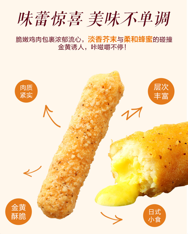 这款蜂蜜芥末心鸡棒,独创的百花蜂蜜与黄芥末酱料夹心灌注工艺,口感清甜回香;加上正大全产业链优质、弹嫩的鸡胸肉,口感层次丰富!外表酥香、夹心柔滑回甜;速冻熟制工艺灭菌,更安全。