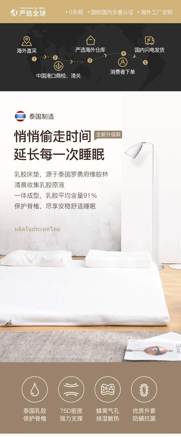 这款乳胶床垫编辑和客服确认是5cm厚度,乳胶源自泰国罗勇府天然橡胶林,含量高达91%以上,工人凌晨4点割胶到生产不超过24小时,尽最大程度的保证原材料的新鲜优质,环保健康。采用德国原装设备,邓普禄改良工艺制作,从割胶--运输到国内,每一步都高标准严格执行。
