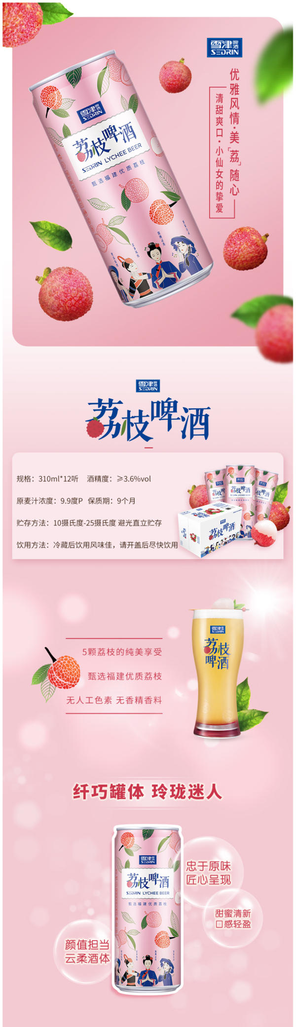 荔枝啤酒,啤酒与荔枝的完美融合,甄选福建优质荔枝,约含5%的荔枝原浆,酒精含量3.6度,原麦汁浓度9.9P,无人工色素,无香精香料,口感轻盈,甜蜜清新,冰镇后口感更佳。高颜值纤巧罐体,小仙女的挚爱。