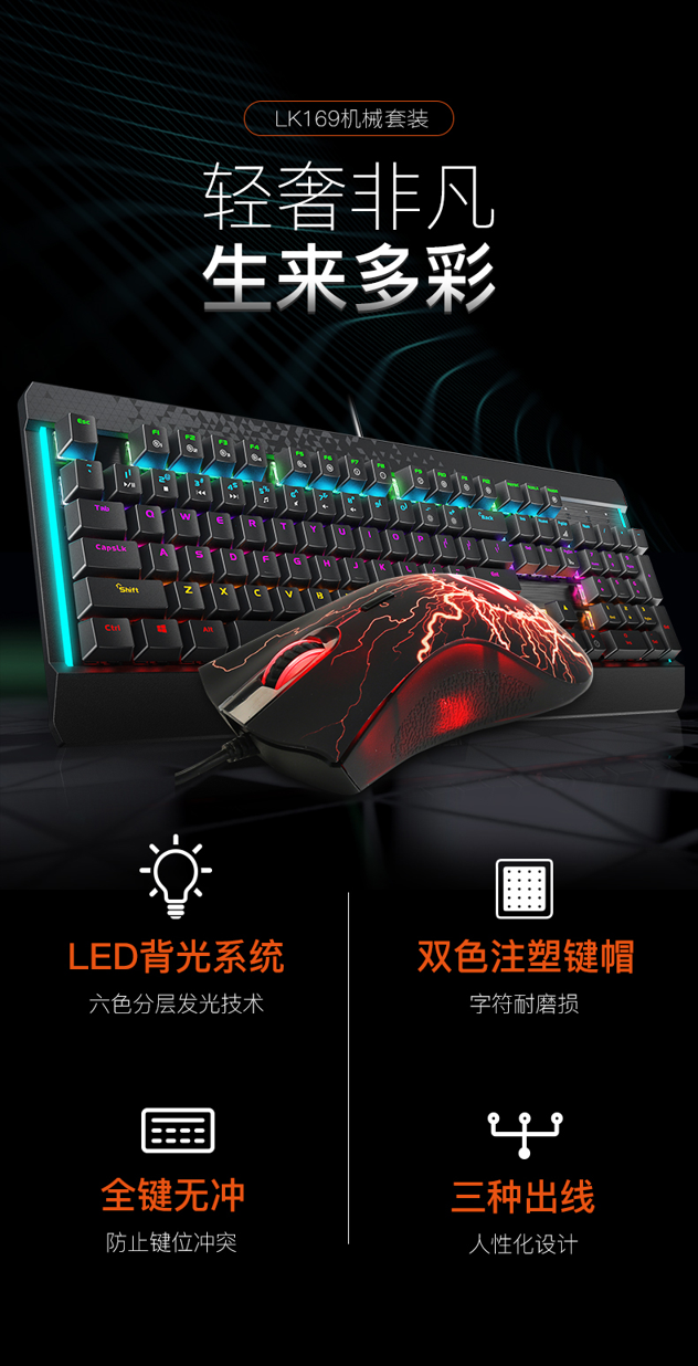 标准的104键布局,带小键盘,全键无冲,使用方便,双色的ABS注塑键帽,字符耐磨损,拥有磨砂般顺滑、细腻手感,采用六色分层的LED发光技术,预设超多灯效,使用炫酷,夜间也能方便使用。