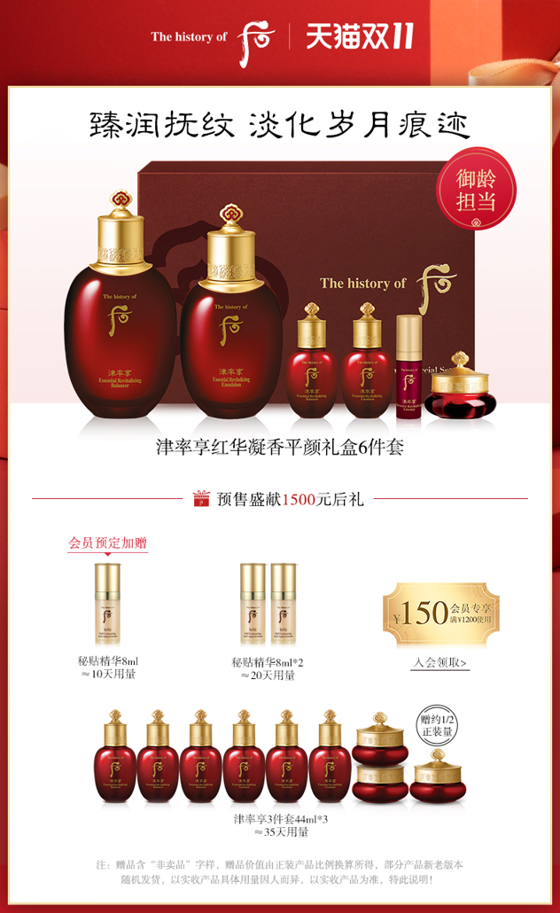 套盒包含大瓶装的滋养液+滋养乳,以及同款小瓶装,还有精华液+面霜。津率享 红华凝香是whoo后系列产品的高端系列,针对老化缺乏营养皮肤中期抗老 ,属于强效功效抗皱产品,尤其适合干性粗糙、脸色暗淡肌肤。