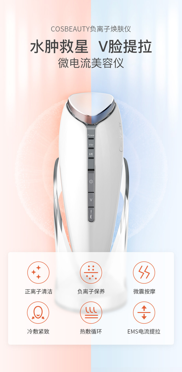 主要作用是正离子清洁、负离子保养、微震按摩、冷敷紧致肌肤、热敷循环、EMS电流提拉塑脸。除了脸部,手臂、腹部、颈部都能用。