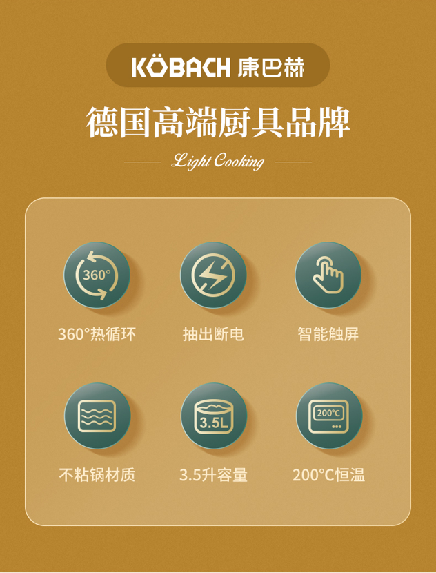 这款康巴赫空气炸锅,灵敏液晶全息屏,时间温度可自己选择,具有自动断电记忆功能,可随时取出查看食物情况。食品级不粘涂层,一冲一抹就干净,方便打理,可拆卸镂空隔油盘,食物残渣好清理。