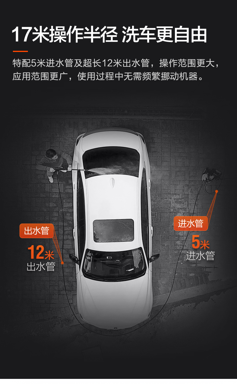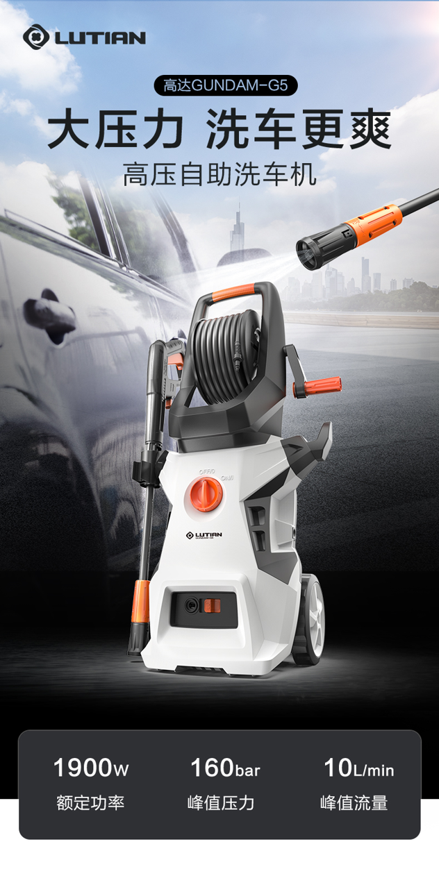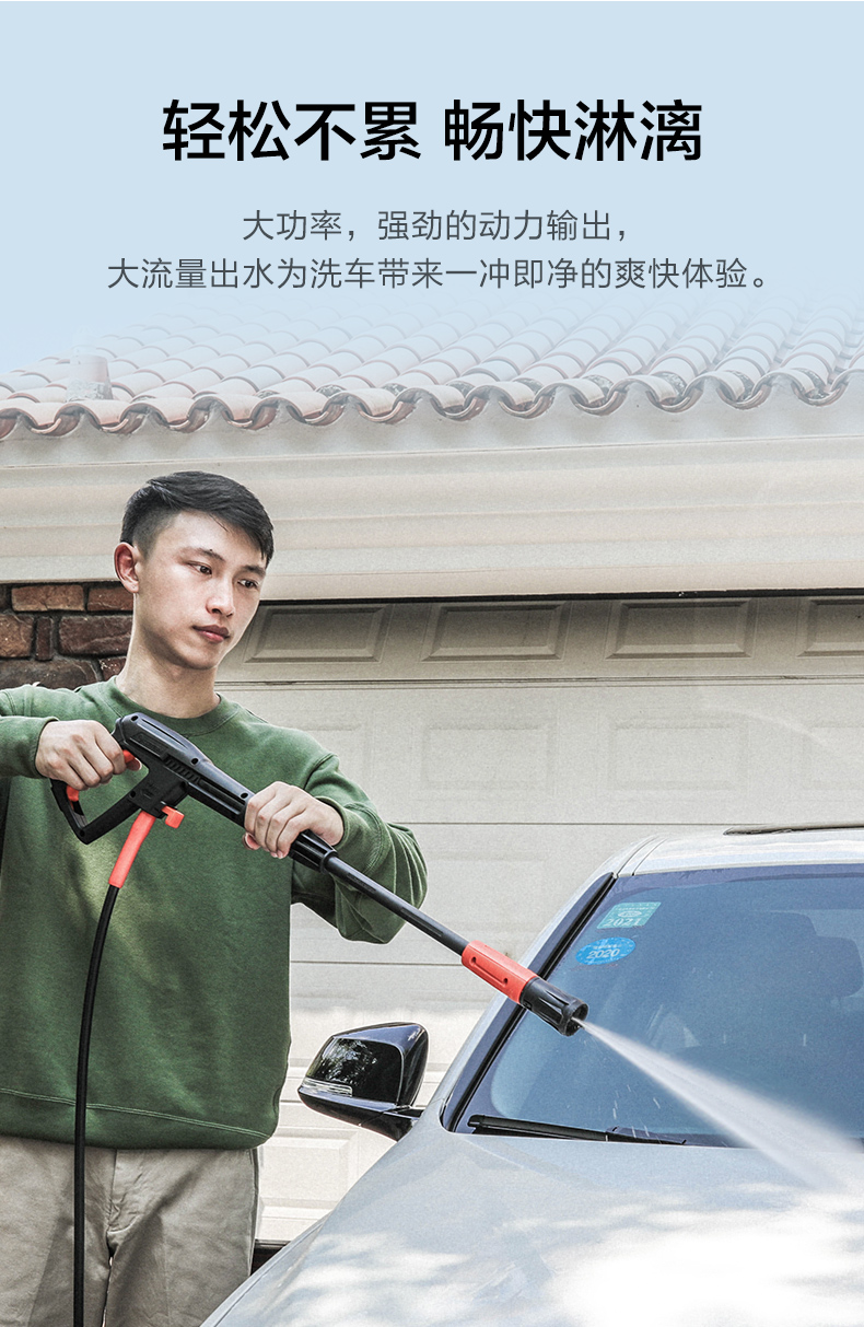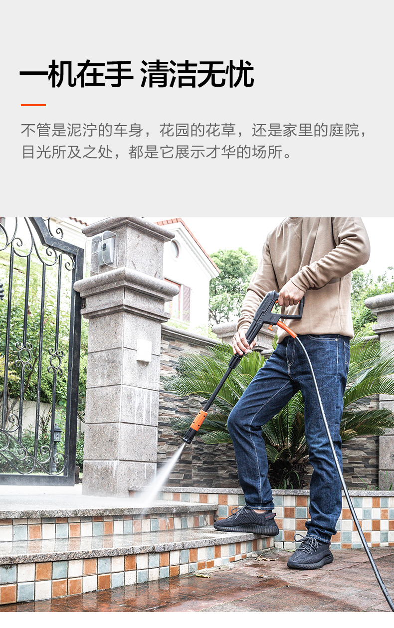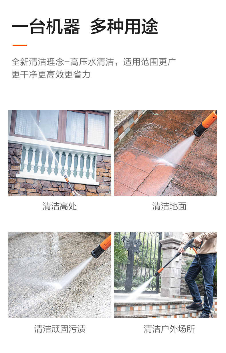 升级版8系能效电机,12片金属风叶,20000转/分钟,功率1400W,电机效率高达65%,能够迸发出100bar压力,可以连接水龙头,也可以自吸式水桶使用,一台机器具有清洗车辆、园艺灌溉、清洗户外及庭院等多种功能。