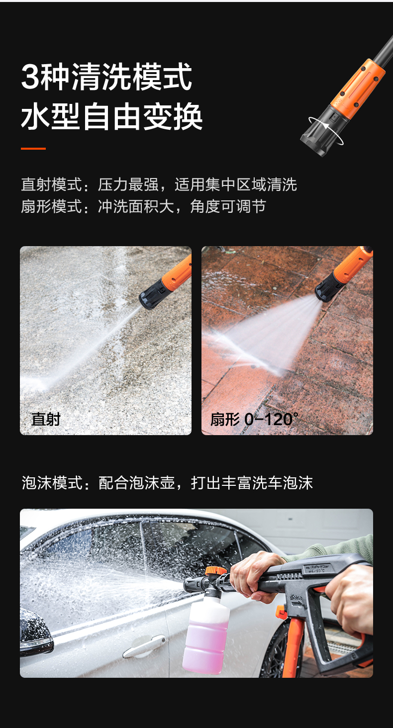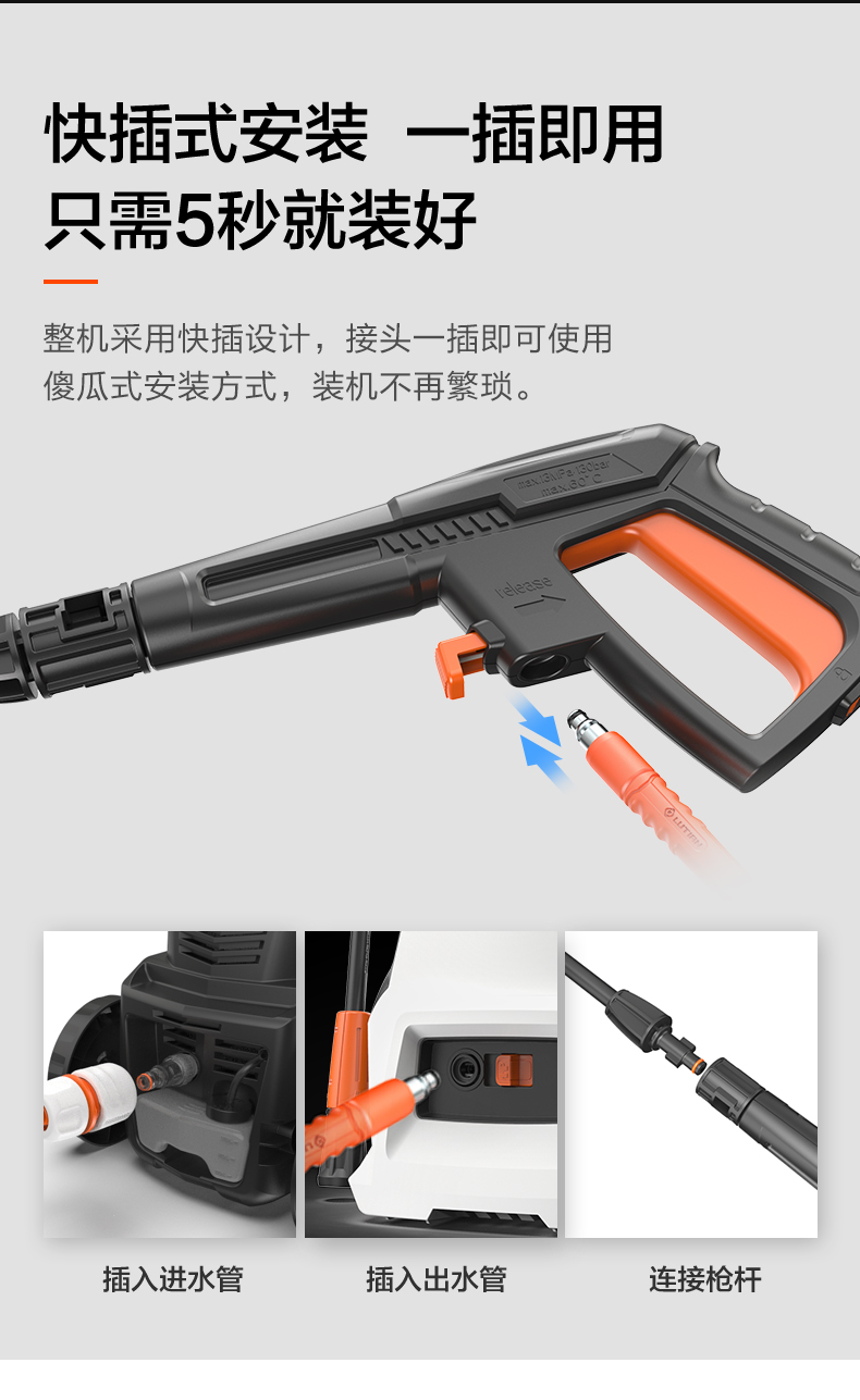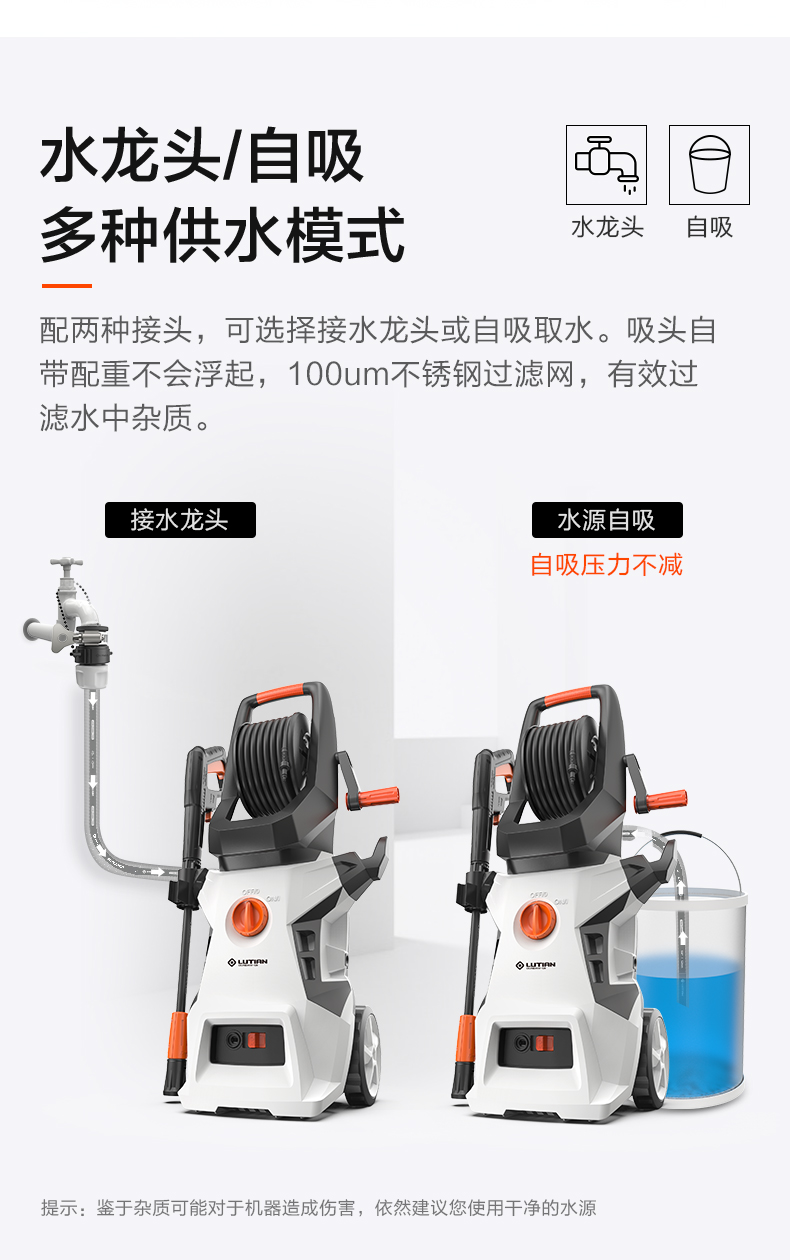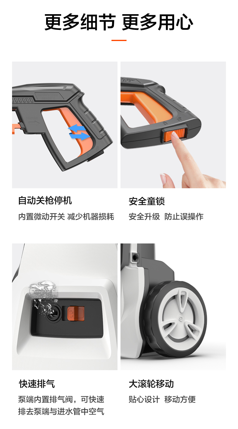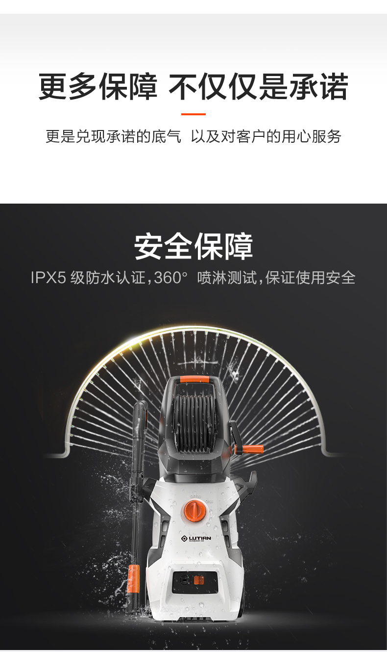 升级版8系能效电机,12片金属风叶,20000转/分钟,功率1400W,电机效率高达65%,能够迸发出100bar压力,可以连接水龙头,也可以自吸式水桶使用,一台机器具有清洗车辆、园艺灌溉、清洗户外及庭院等多种功能。