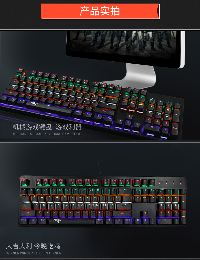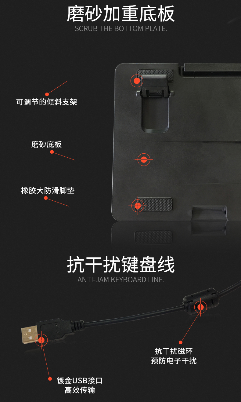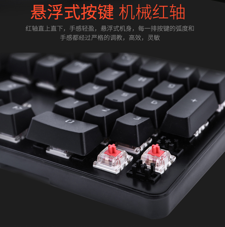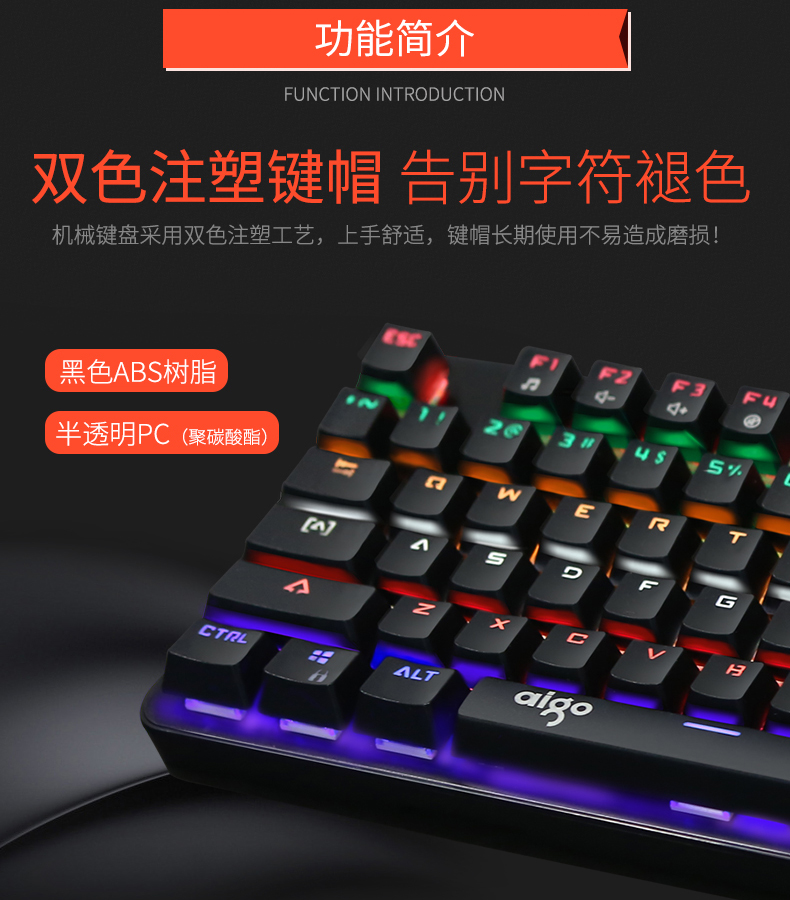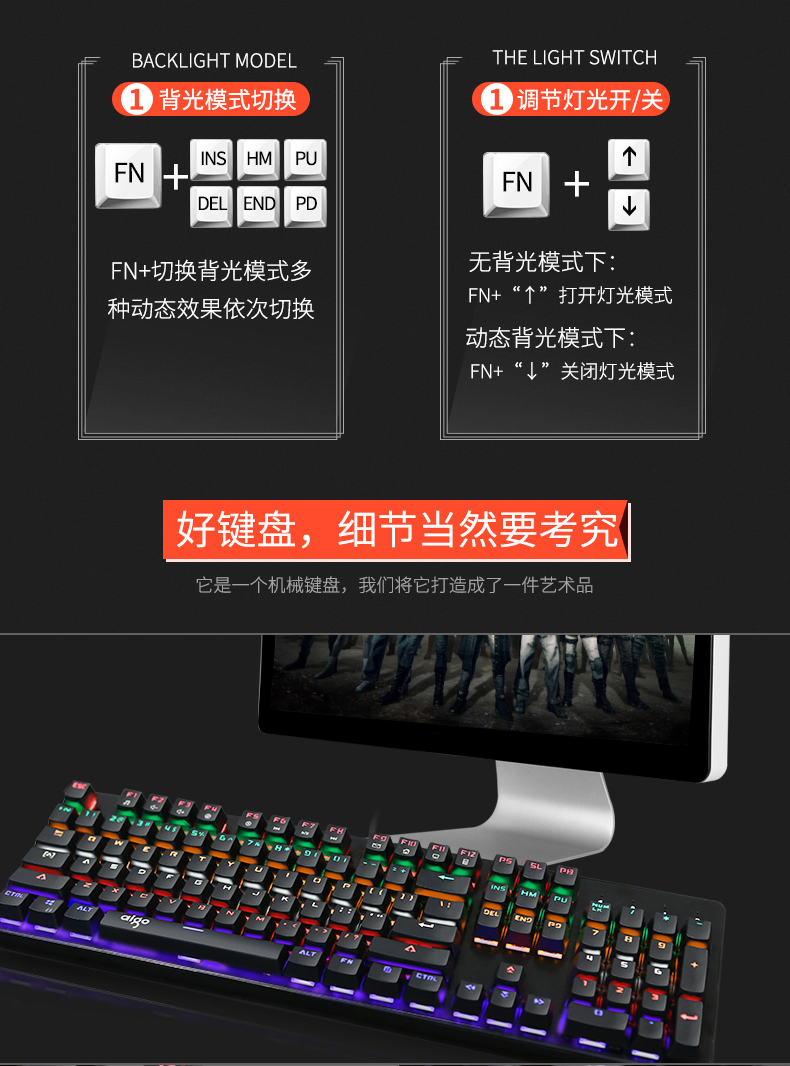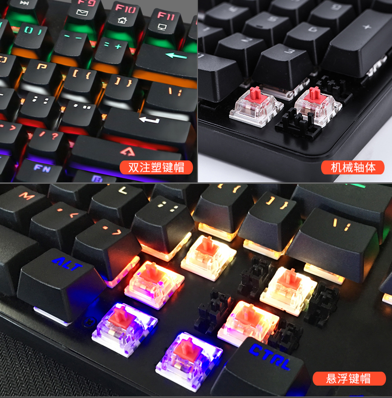 键盘采用标准按键设计,全键无冲,支持多种背光模式。面板采用铝合金一体成型,提升品质耐用度,键盘底部有排水孔放溅水设计。键帽采用双色注塑工艺,长时间使用不掉色,不沾指纹。