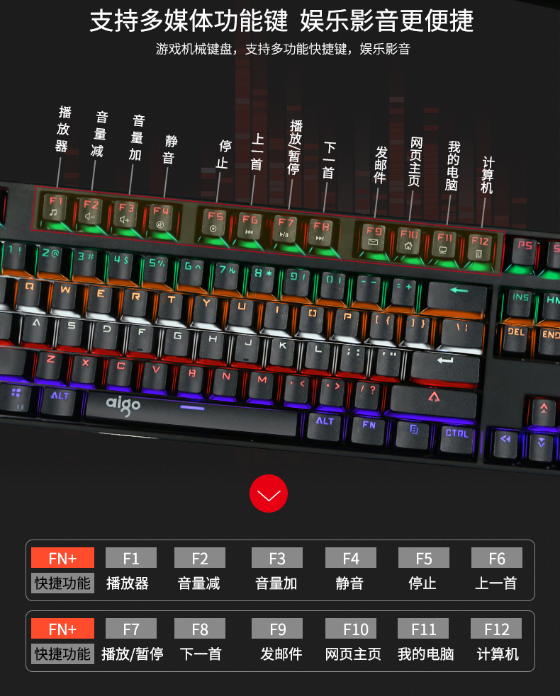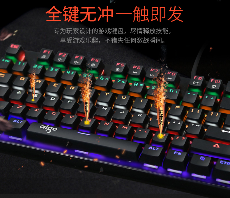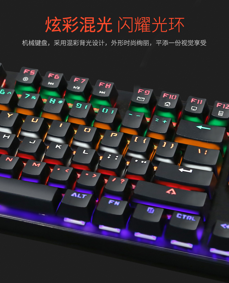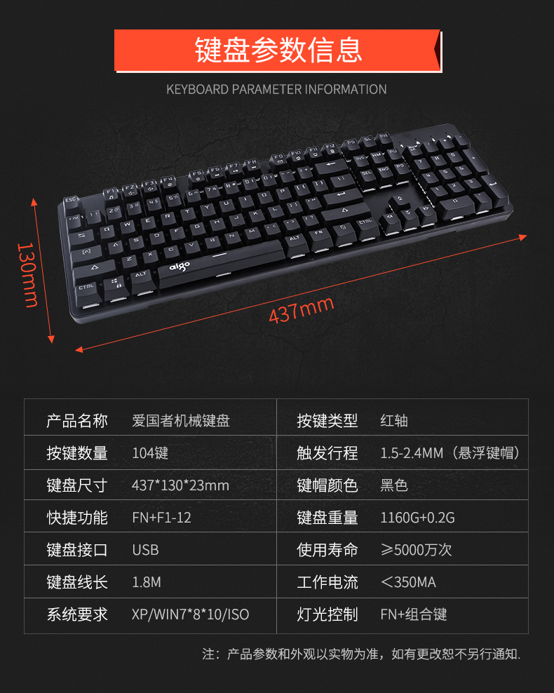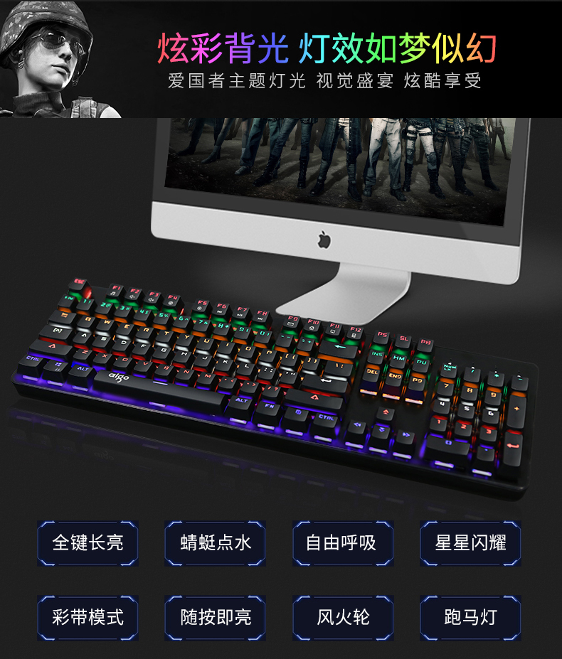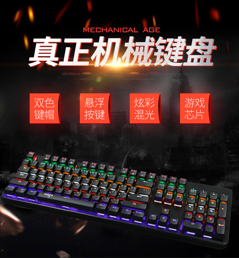 键盘采用标准按键设计,全键无冲,支持多种背光模式。面板采用铝合金一体成型,提升品质耐用度,键盘底部有排水孔放溅水设计。键帽采用双色注塑工艺,长时间使用不掉色,不沾指纹。