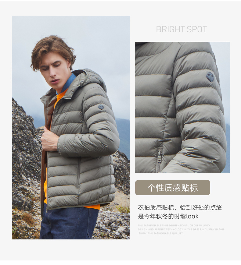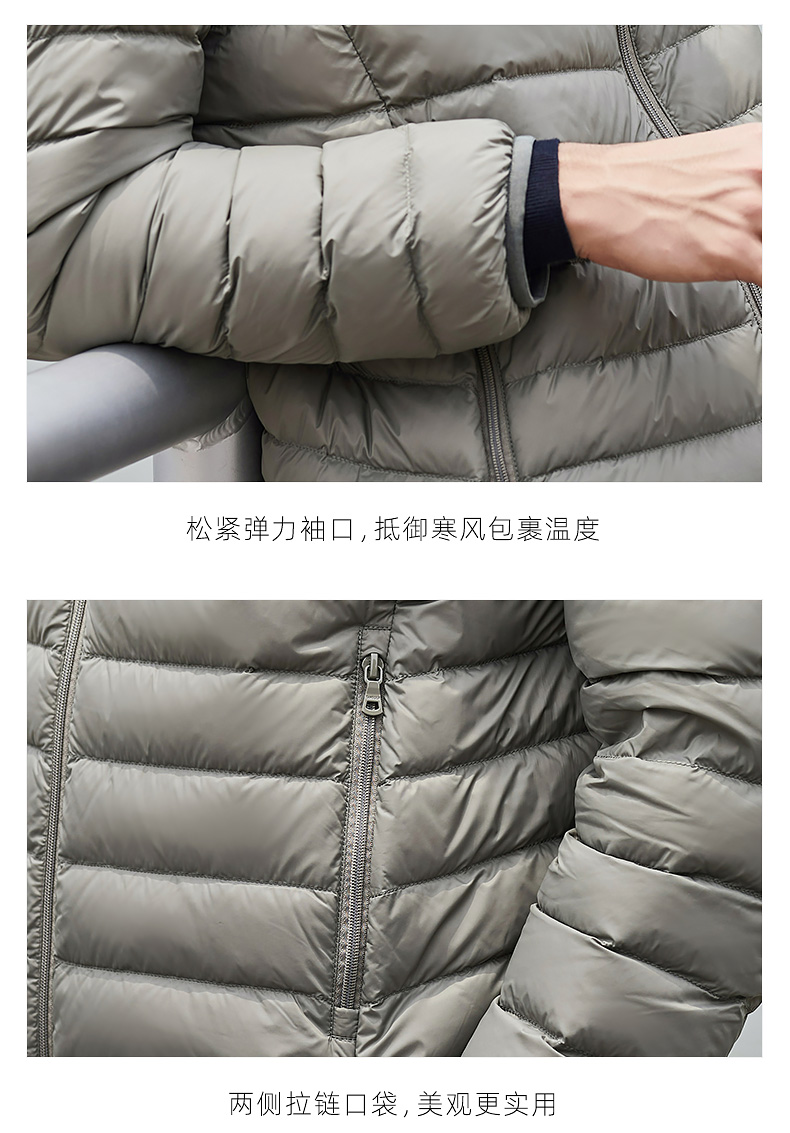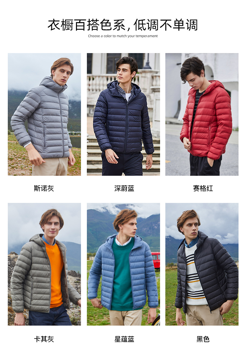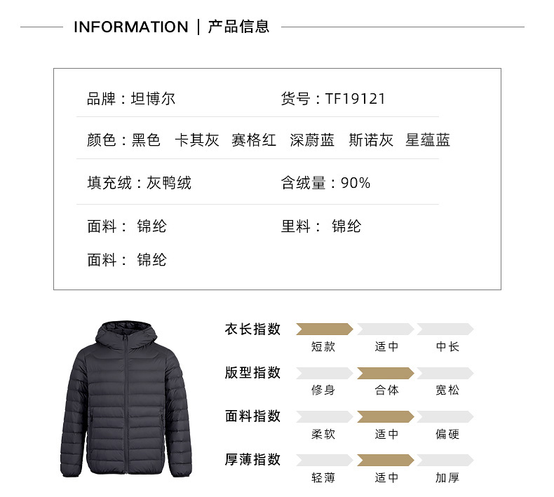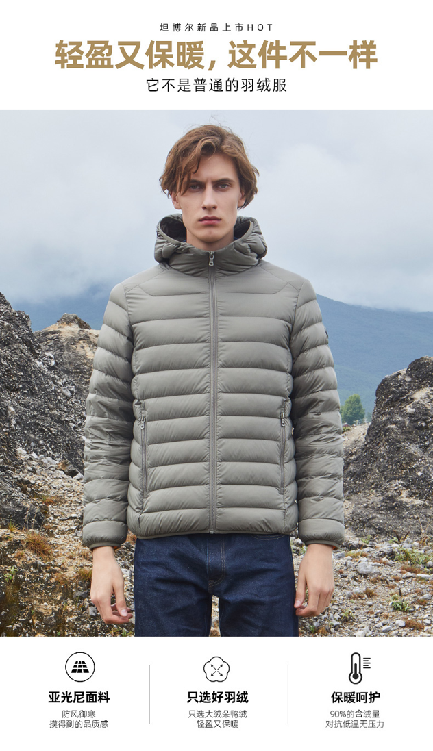 坦博尔,中国驰名商标,线下2000多家门店。采用高密度轻柔细锦纶纱面料,3000万微孔导湿,光泽度好,防水渍、防钻绒。内部填充高蓬松度鸭绒,90%鸭绒含量,手工分格充绒,整体重量轻,轻便保暖。简约纯色款式,商务休闲百搭。