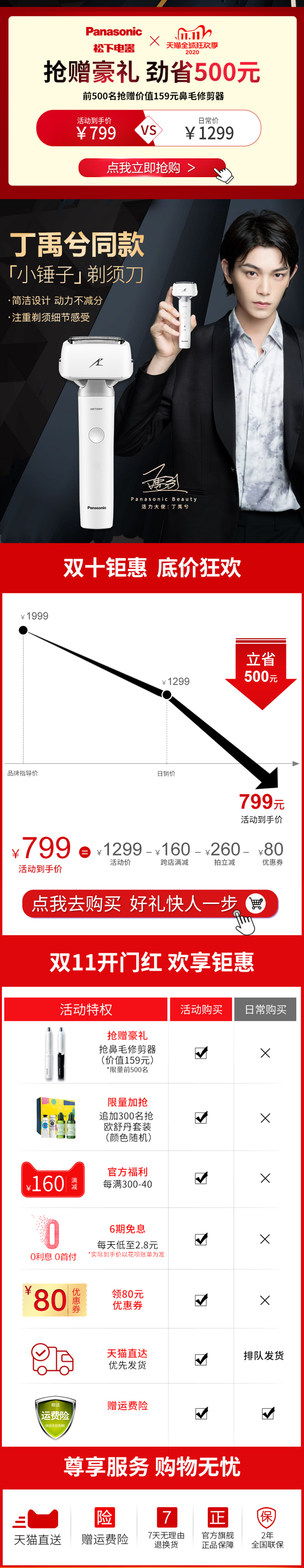=799元到手价。松下 朗达/LAMDASH系列,往复式电动剃须刀外层网膜薄、面积大、相同面积网眼更多、网膜下的空间几乎都可用于切断胡须等特点,更适合浓密、硬短的胡须。
