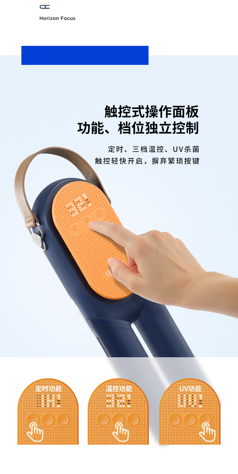 长条形出风口,实现循环风幕,巧妙利用衣物自成风罩,从内而外均匀干衣。底部设有UV紫外灯,自带杀菌功能,烘干的衣物也可带有太阳的味道,除菌率高达99%,三重安全防护,NTC智能温控探头,75度温控暂停,100度熔断丝自动断停,安全放心。