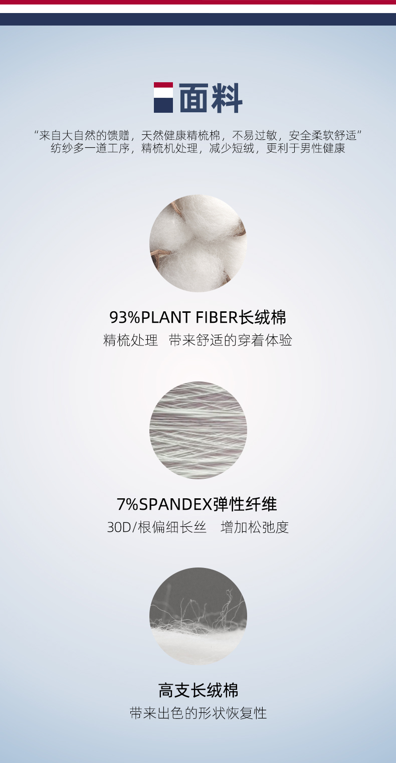 面料为93%精梳长绒棉+7%弹力纤维混纺,拥有非常好的弹力,贴身舒适不紧绷,另外60支相比40支纱线更细,面料编织更紧密,更加轻薄透气。触感非常柔滑、透气、垂感好,非常适合夏季穿着。