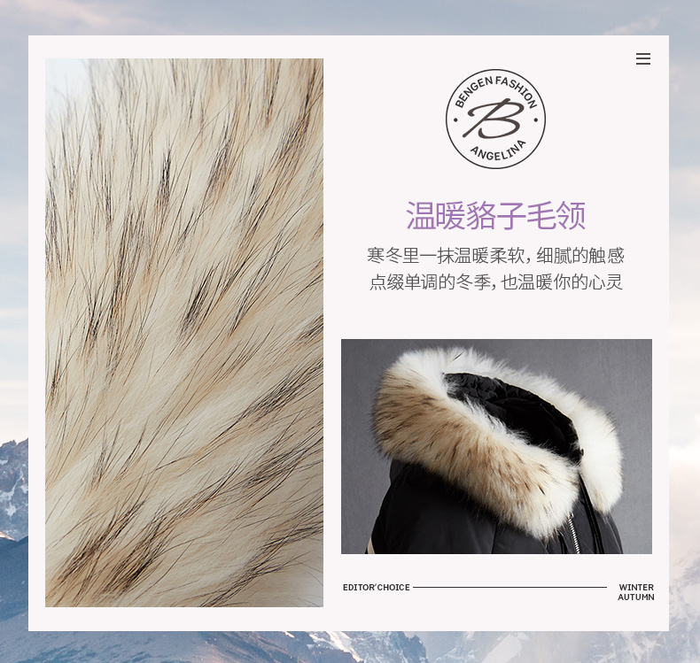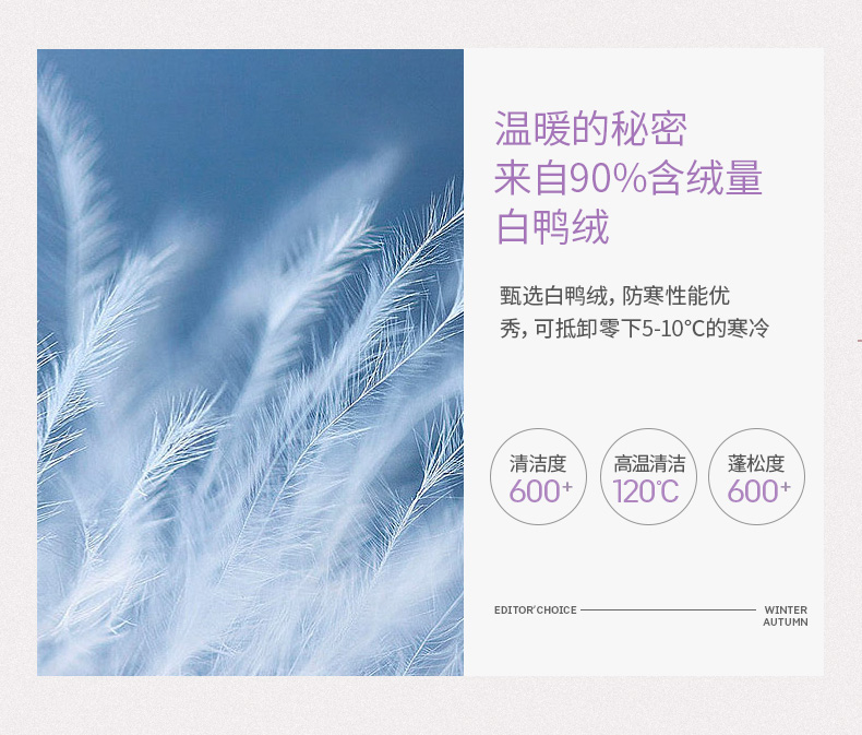 这款冰洁女士羽绒服,内里填充高品质90鸭绒,蓬松度达到了600+,经过120℃的高温蒸汽烘干消毒,洁净度高,保暖效果更好。采用锦纶面料设计,面料四层架构设计,质感舒适,高密锁绒,不易跑绒钻绒,出门满满安全感。经典中长款,出门时尚百搭~