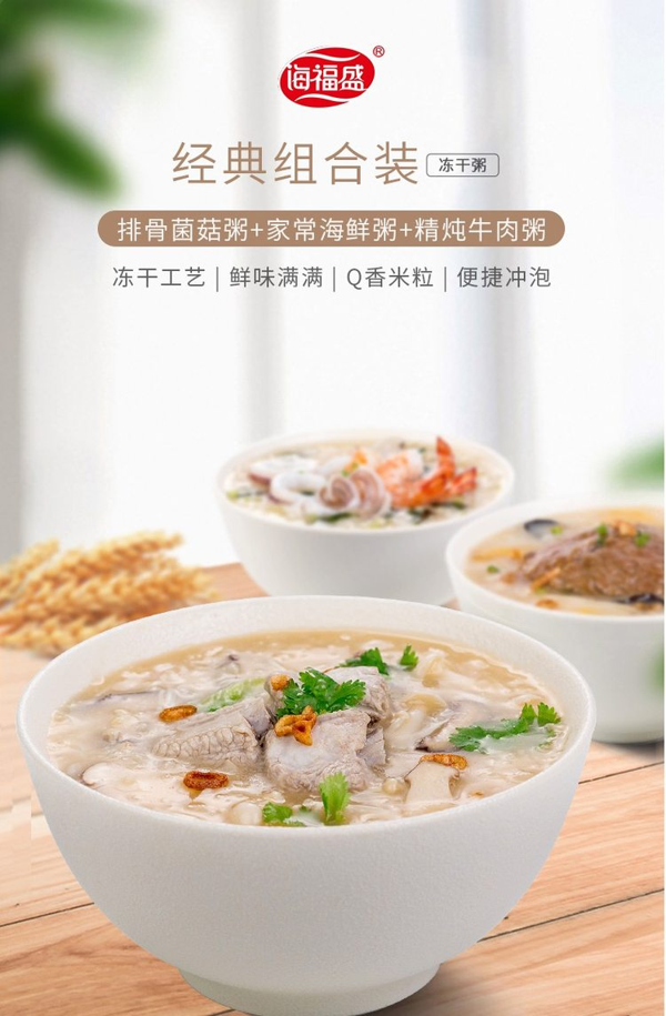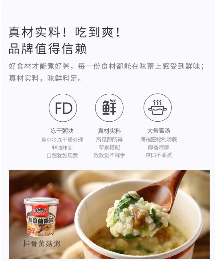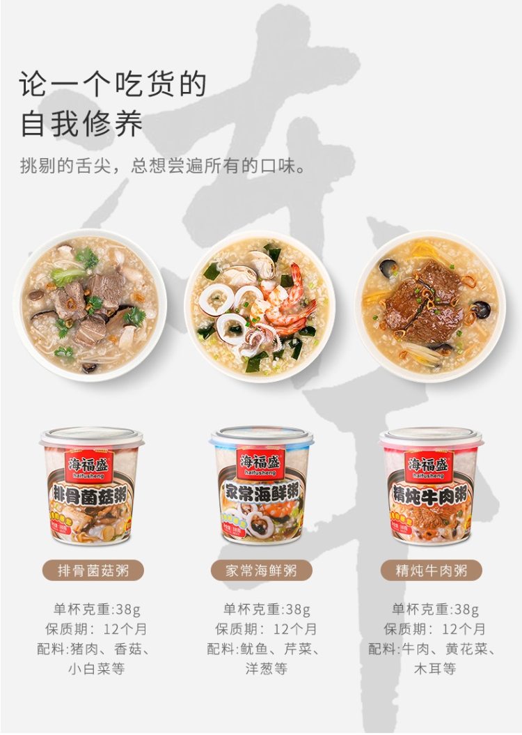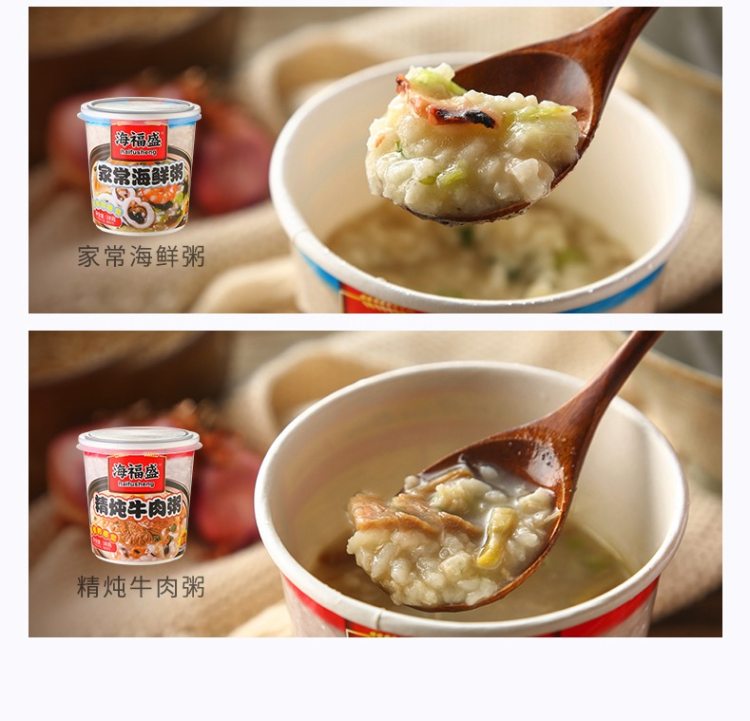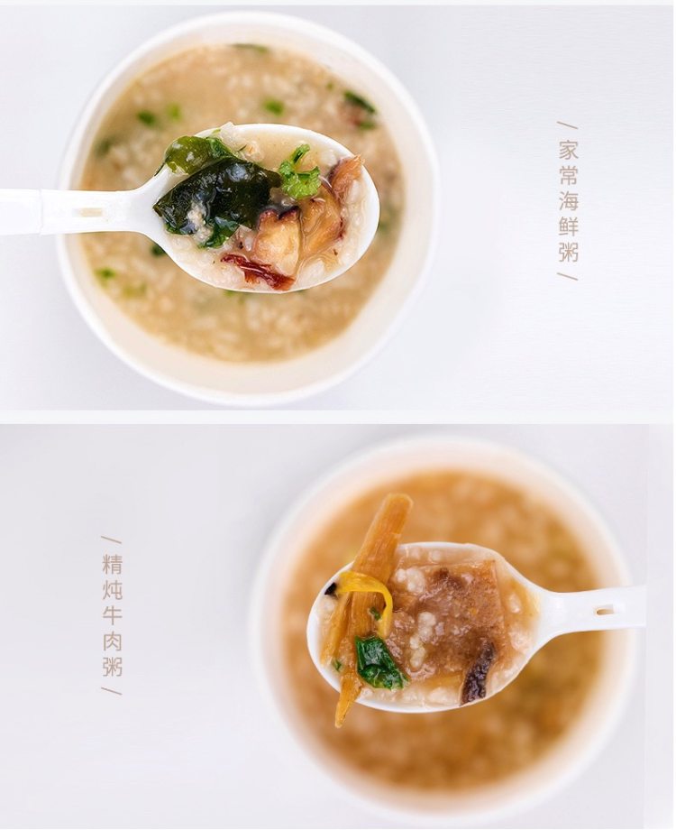 新低价,规格38g*6杯。有精炖牛肉粥、排骨菌菇粥、家常海鲜粥三口味各2杯,冲泡即可实用,非常方便,日常来不及买早饭的,直接来一杯。