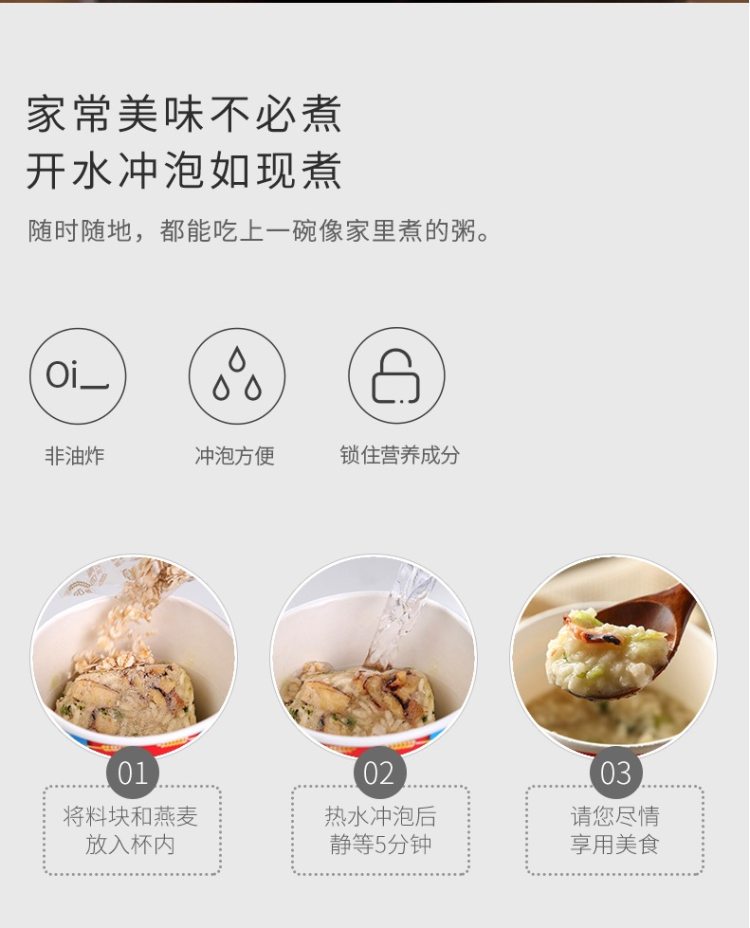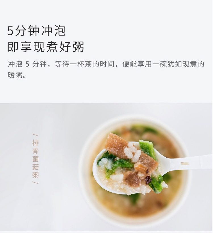 这个粥小编吃的是排骨菌菇粥,味道很浓厚,粥里面的粥和燕麦分开装,粥的话有一点空心粉的感觉,和平时自己煮的粥口感不一样,但是并不难喝,开水冲泡5分钟,即可食用,方便快捷,下午饿的时候吃一个还是不错的。