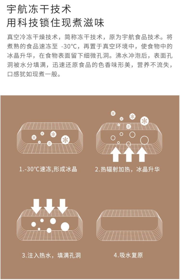 FD即真空冷冻干燥技术,最早广泛应用于医药、生物、航天、航空事业等。采用快速冻结,真空冰状脱水,很好的保留了食材的色香味及营养成和食物外观,具有良好的复水性。即使不添加任何防腐剂,就可以保存很长时间。