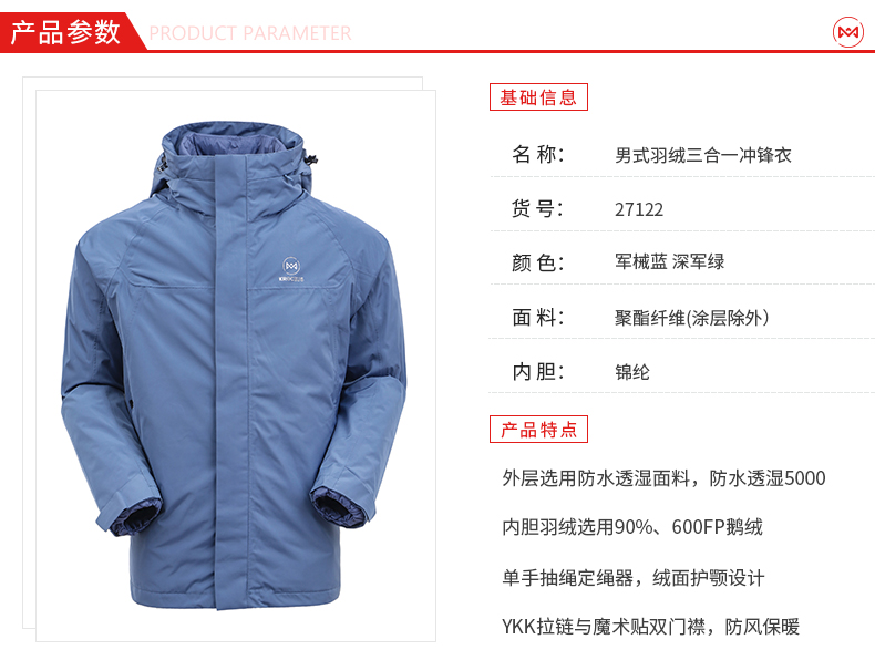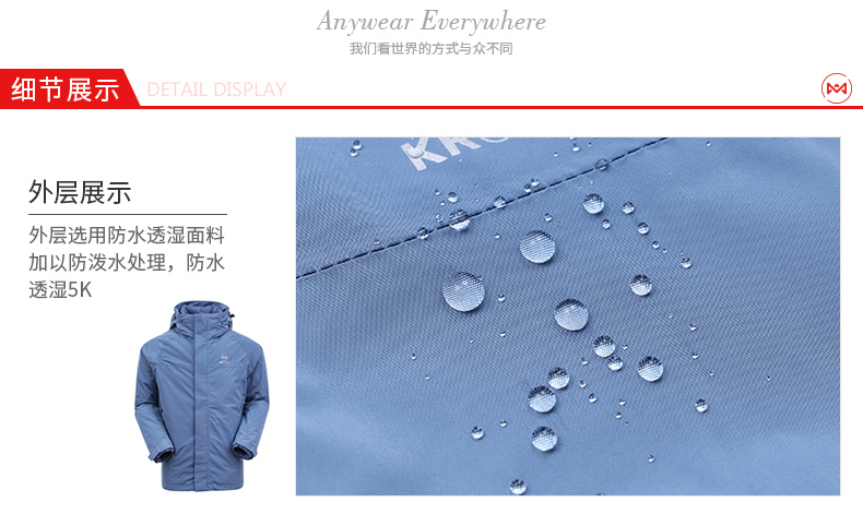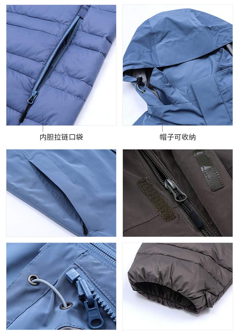 在款式和细节上,外套和内胆都是合身版型,冲锋衣是连帽设计,有可调节松紧的卡扣,魔术贴袖口,双重门襟。羽绒内胆有绒面护颚设计,避免因为拉链伤到脖颈,所有的口袋都用日本YKK拉链开合。