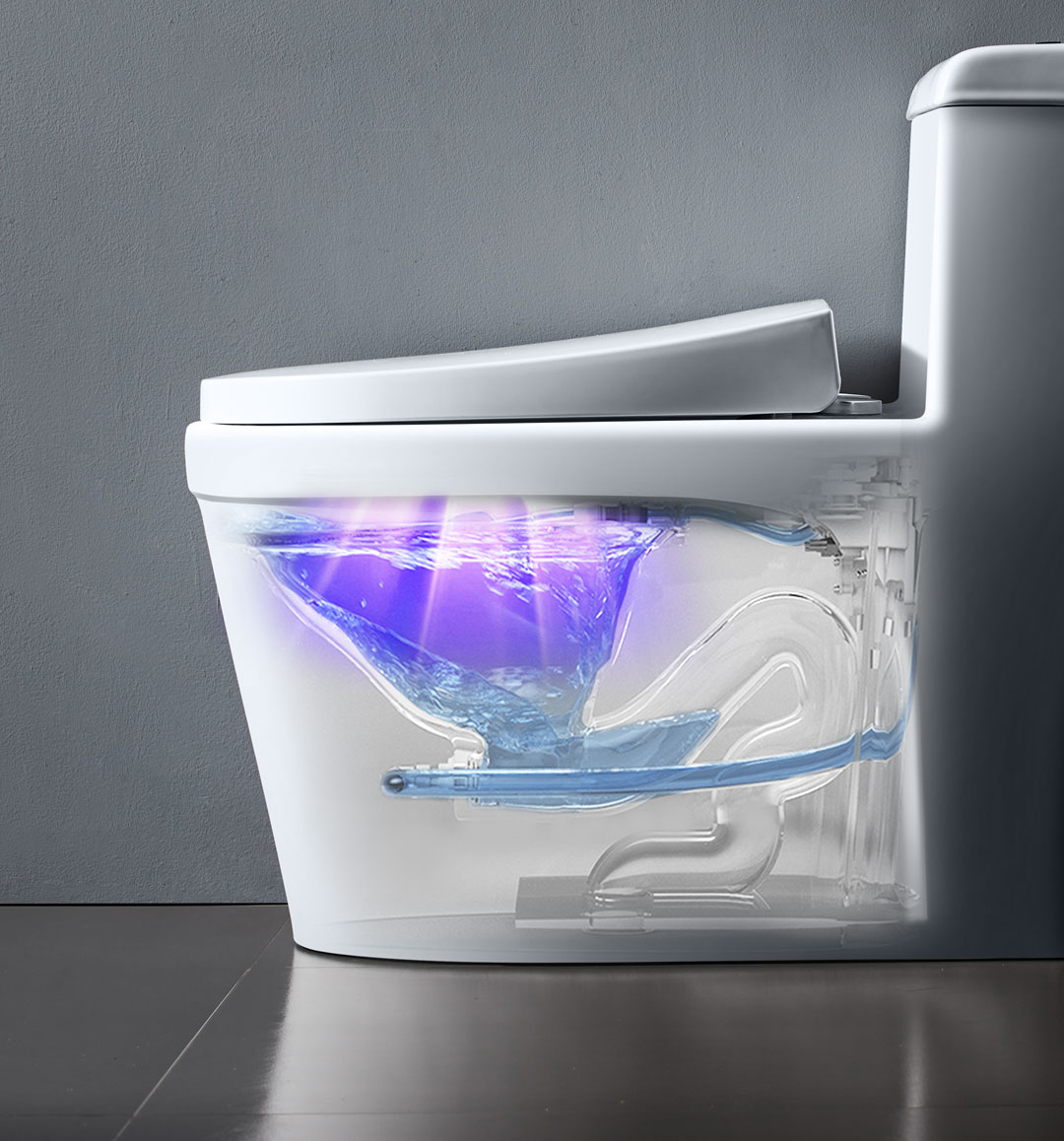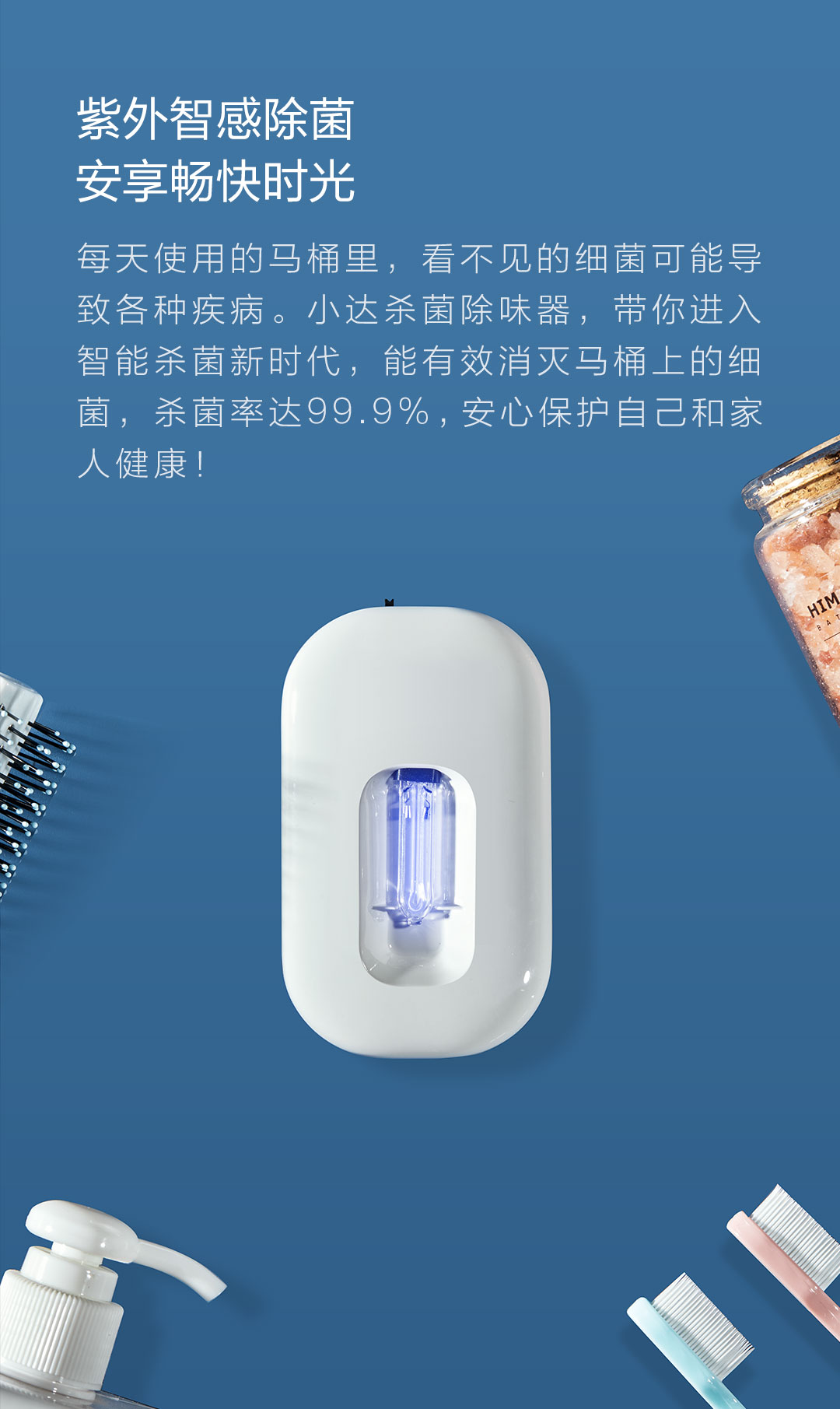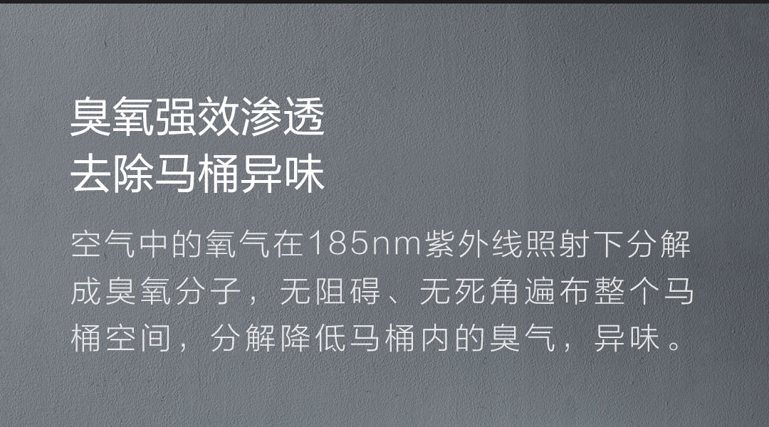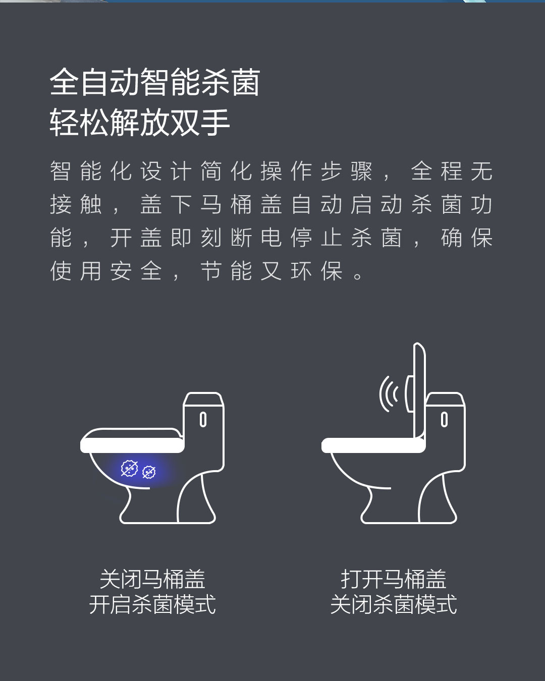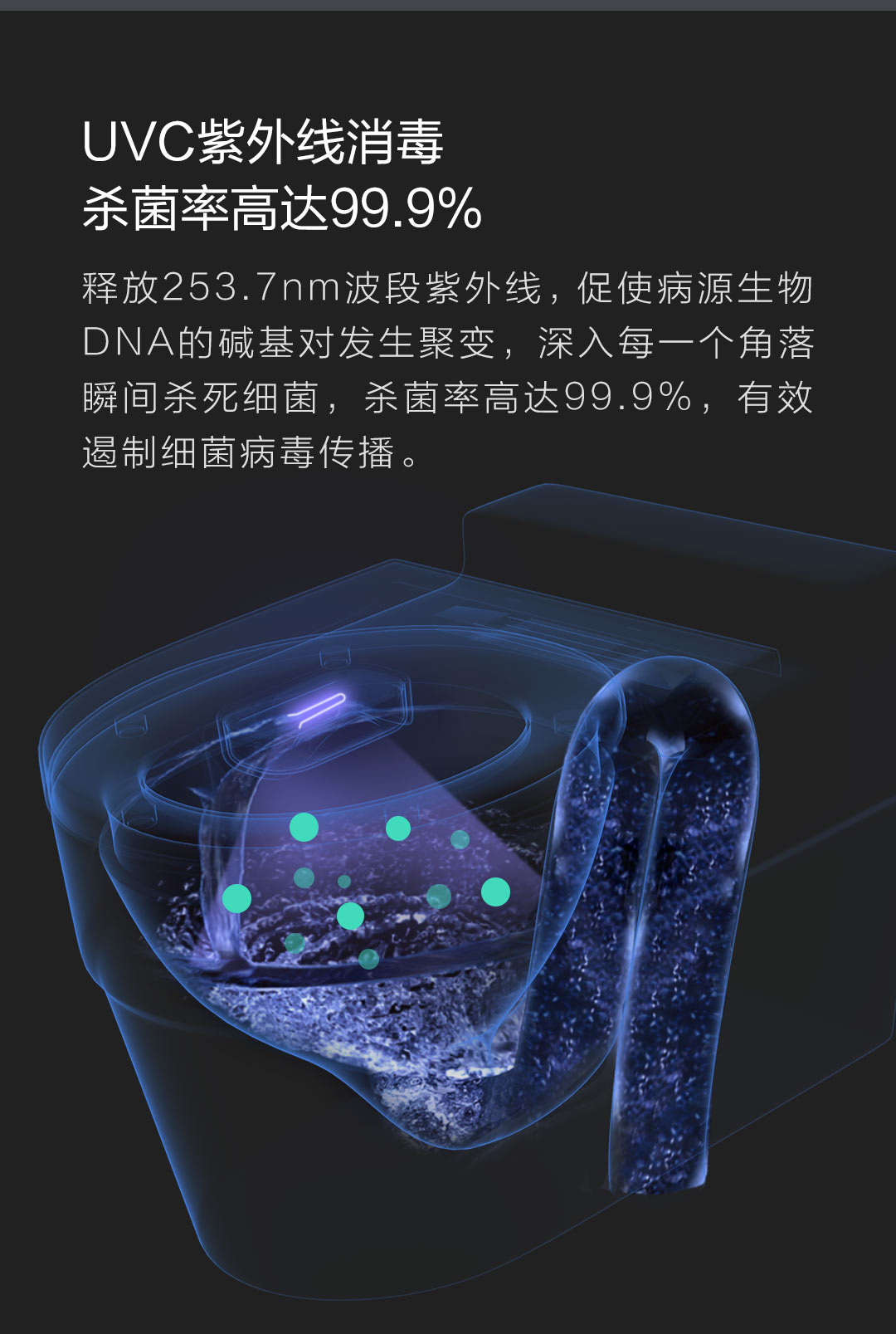 UVC紫外线杀菌率高大99.9%,瞬间杀死细菌,有效避免病毒细菌等传播。臭氧强效渗透,无阻碍遍布马桶,不留消毒死角,并有效减少臭味异味。